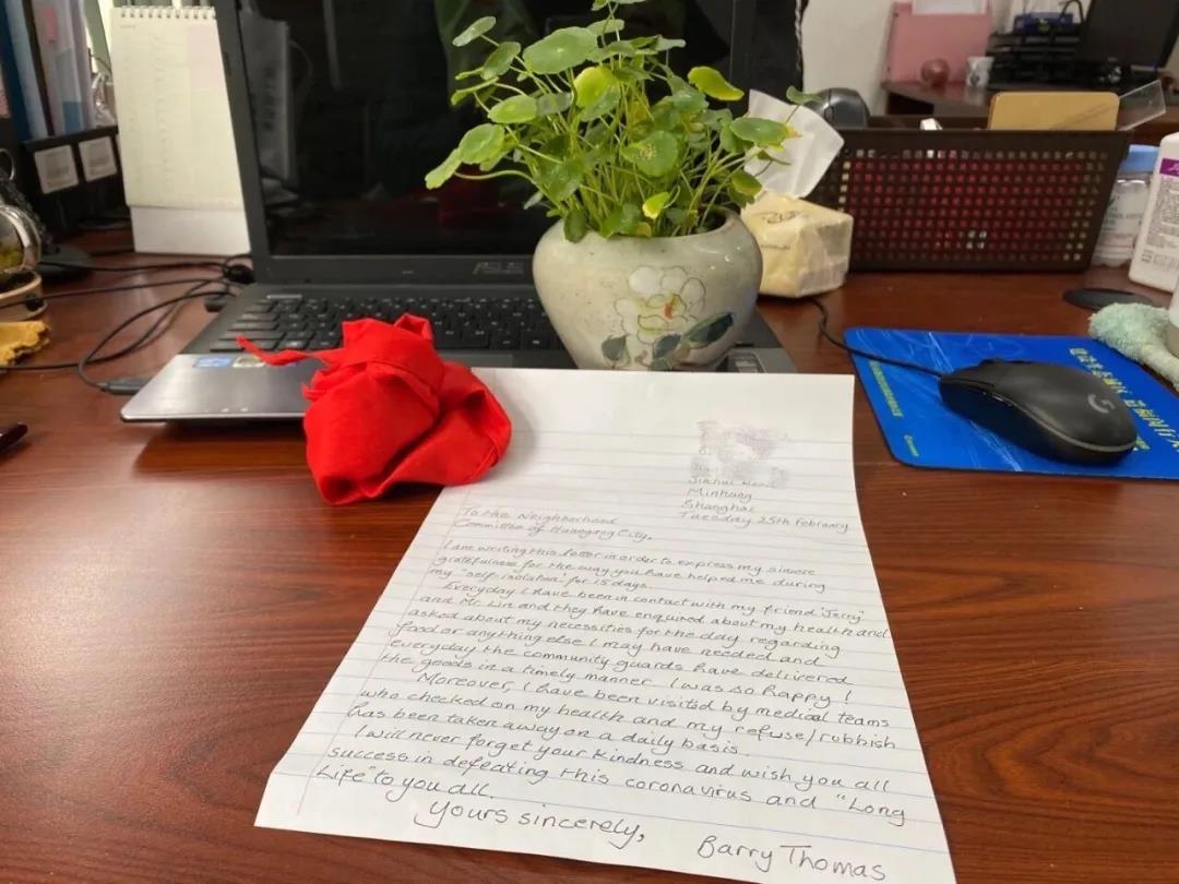 2月25日早上,居委会书记彭竑和林钧渊一同来到巴里家,给他送上他期待已久的出入证,而这也宣告了他的隔离期满,可以“重获自由”了。激动万分的巴里拿出用红绸带包裹的一封手写感谢信递给了彭竑,感谢社区所有热心人对于他的关心和照顾,并衷心祝愿中国抗疫能取得胜利。