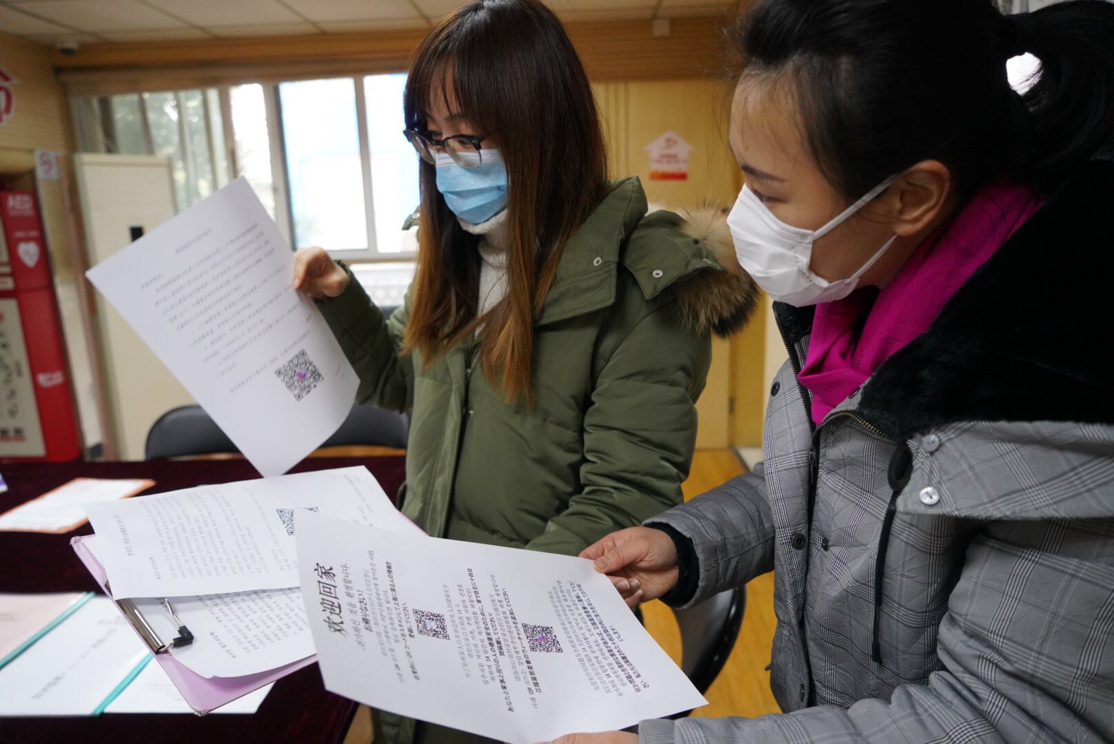 “好的好的,我带下口罩。”不久,女主人就开门并将手腕伸出,让居委会工作人员测温,并让家中其他成员也来测温。在韩语志愿者王老师的翻译下,双方很快就完成了任务。