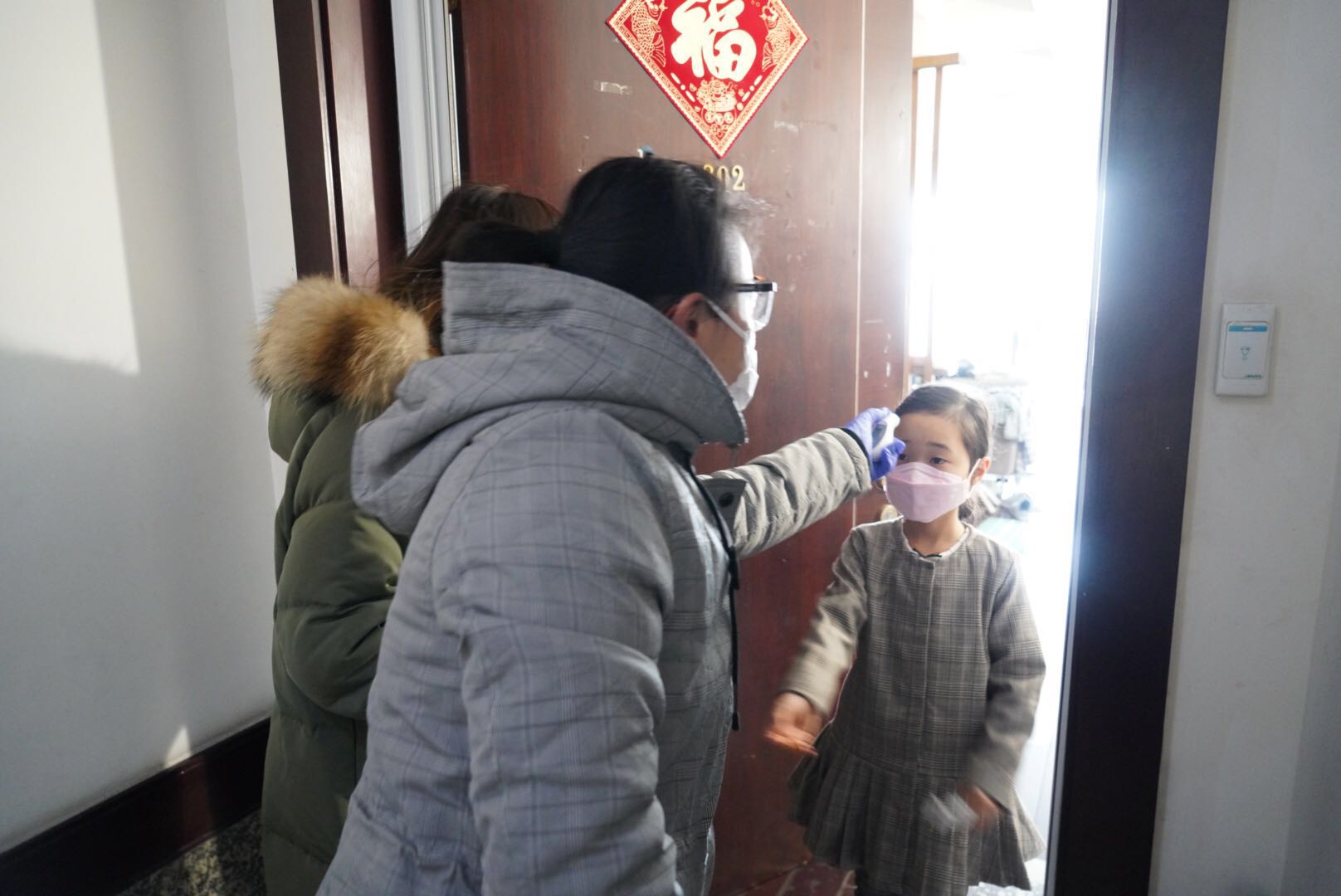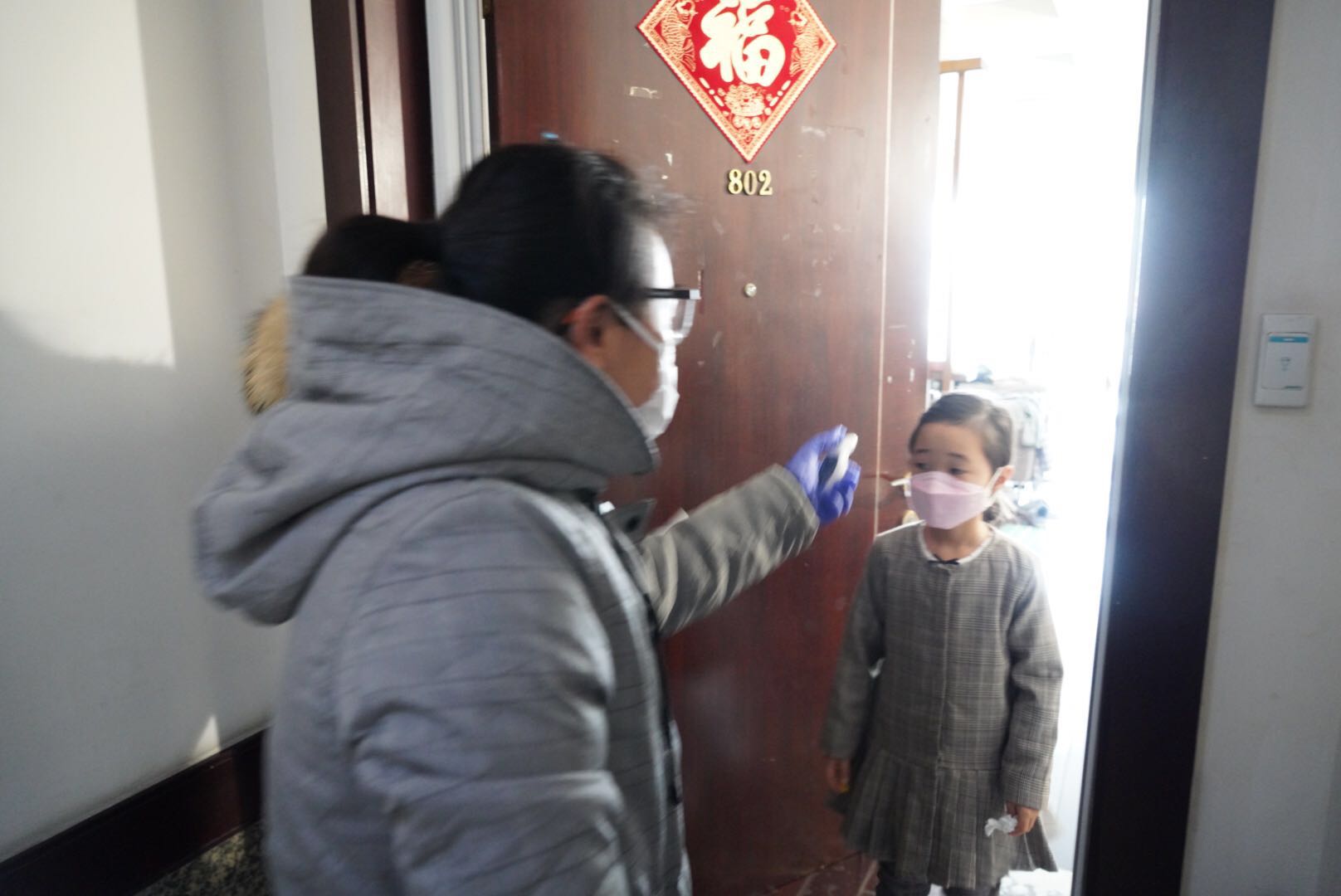 “你好,我们是居委会的。”下午3点不到,记者跟随江临财富居委的外语志愿者王老师和社区社工刘简珏,为江临天下小区内一户几天前刚刚回沪的韩国家庭进行日常测温检测。刘简珏告诉记者:“这家妻子是上海人,丈夫是韩国人 还有个女儿。前几天刚从韩国回来,目前正处于14天隔离期。”