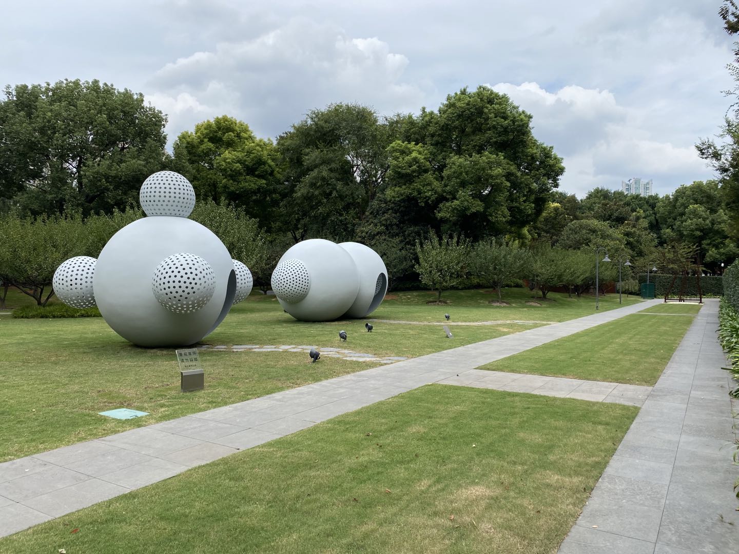 三个圆滚滚的金属球,“躺”在地上,球体上还开着门,人可以走进球里看看内部空间。