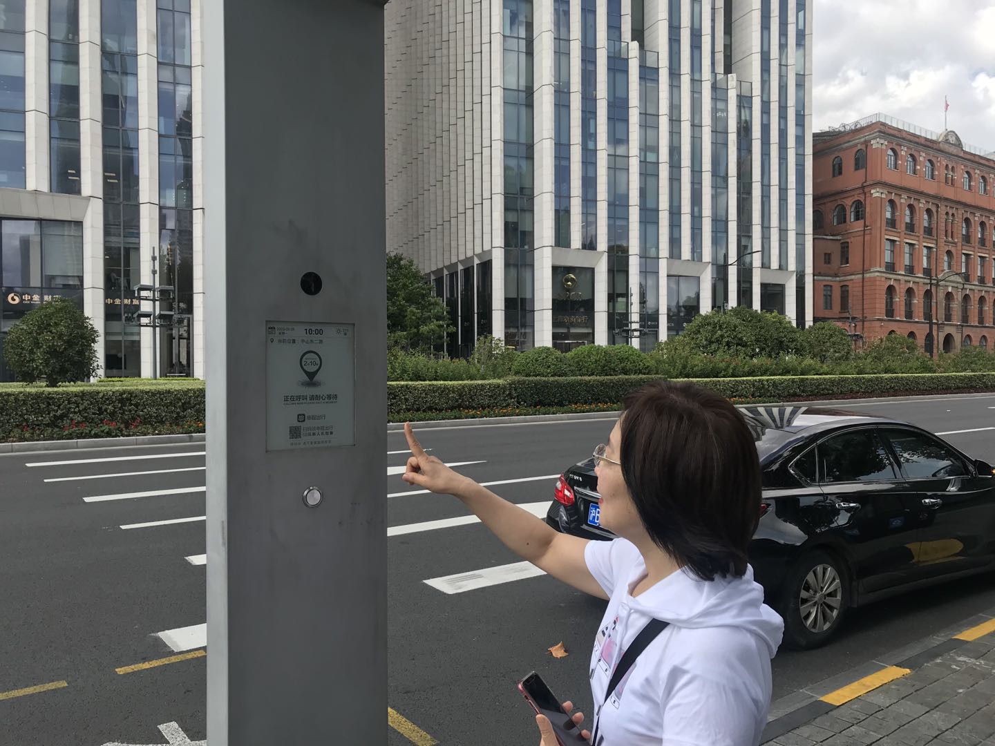 上午10点,在中山东一路、新开河路附近的一个“扬招杆”旁,市民朱女士按下“呼叫键”,大概过了5分钟,“扬招杆”的屏幕显示有司机接单。