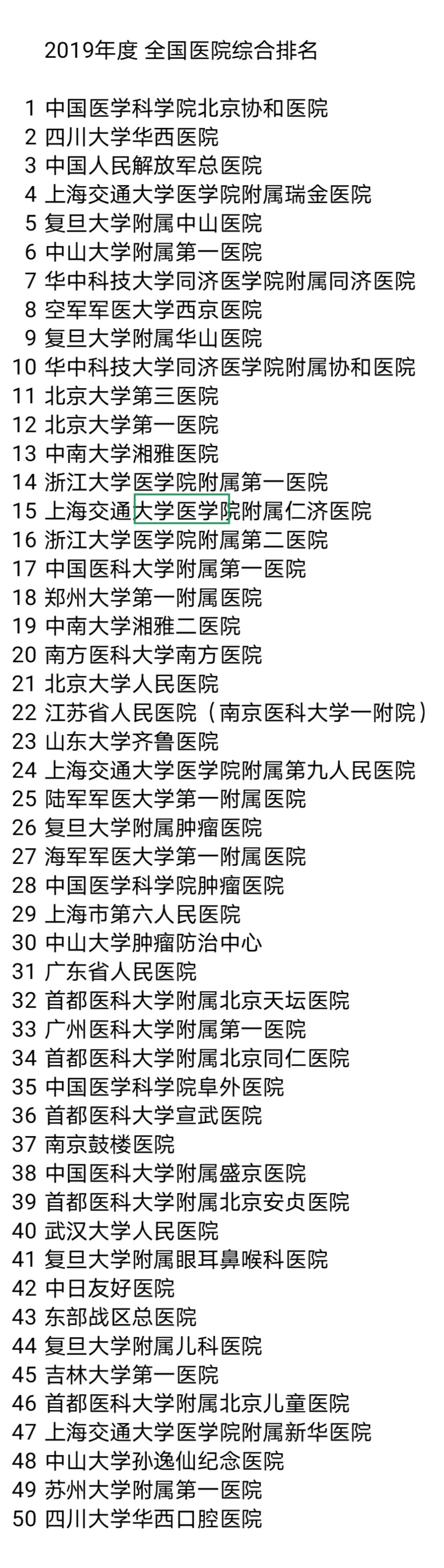 11月14日,复旦大学医院管理研究所在上海颁布《2019年度中国医院排行榜》、《2019年度中国医院专科声誉排行榜》和《2019年中国医院专科综合排行榜》。中国医学科学院北京协和医院、四川大学华西医院、中国人民解放军总医院、上海交通大学医学院附属瑞金医院和复旦大学附属中山医院继续雄居排行榜前五名。