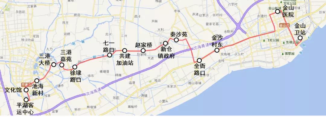 平石线全长约49公里,金山区内走向为金山大道、东平北路、龙航路、杭州湾大道、隆安东路至铁路金山卫站,为了方便市民就医,中途设置金山医院一处停靠站点。线路由平湖市天龙城乡公共交通有限公司负责运营,拟投入运力3辆8.5米新能源纯电公交客车,日发班次9班次。