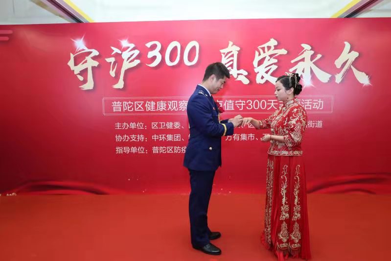 据悉,新郎傅泽宇是普陀区健康观察真如点消防组的一员,在健康观察真如点连续值守300天之际,这场迟到了8个月的婚礼更显得意义非凡。