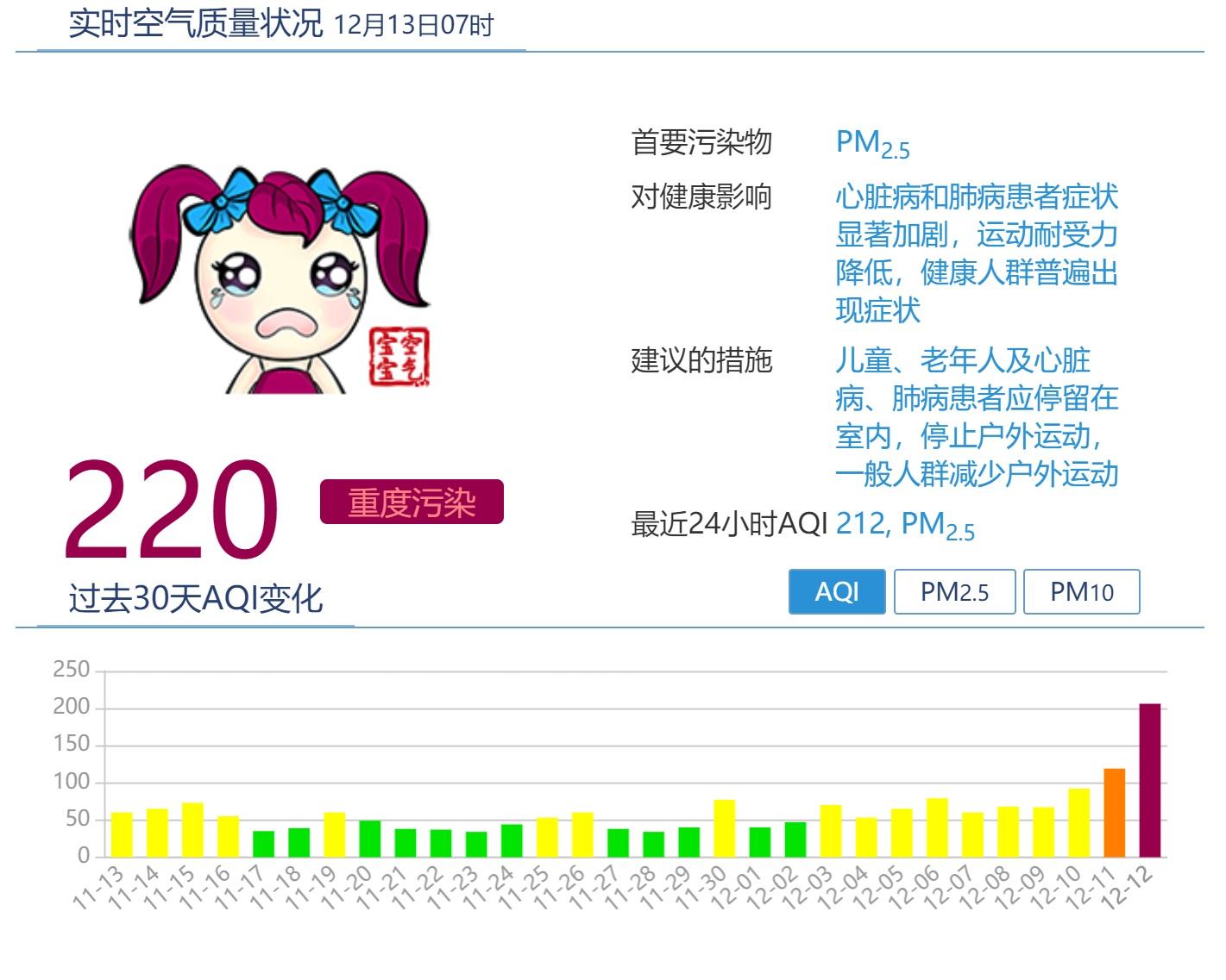 数据显示,12月13日7时,实时空气指数为220,重度污染。建议儿童、老年人和心脏病、肺病及其他慢性疾病患者尽量停留在室内,暂停户外活动;一般人群减少户外活动,尽量减少开窗通风时间。室外作业人员采取必要的防护措施。