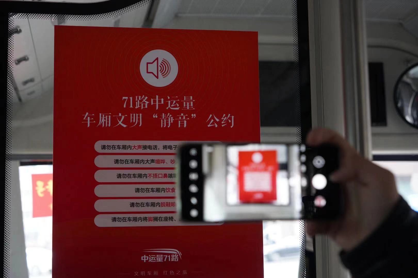 此次71路中运量车队推出的“静音”公约主要有6条内容,包括“请勿在车厢内大声接电话,将电子设备声音外放”“请勿在车厢内大声喧哗、吵闹、嬉戏”。“请勿在车厢内不捂口鼻咳嗽打喷嚏”“请勿在车厢内饮食”“请勿在车厢内脱鞋晾脚”“请勿在车厢内将脚搁在座椅、扶手杠上”。