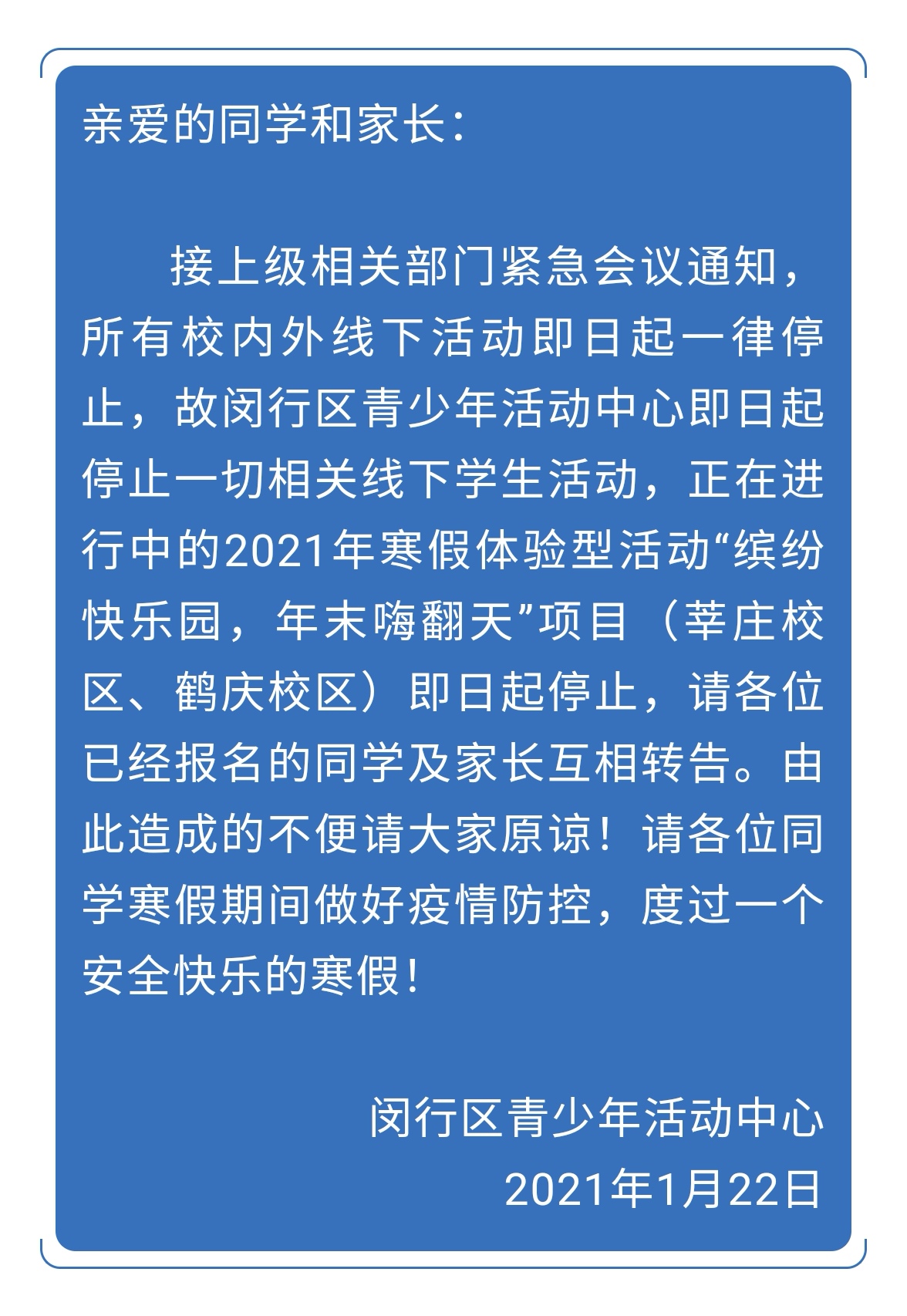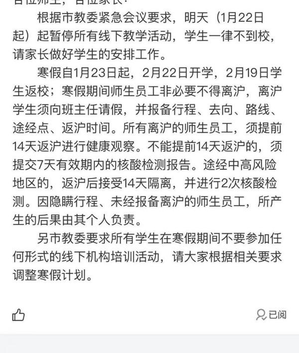 据了解,昨天黄浦区最先下发通知,要求全区中小学幼儿园1月22日不返校。通知指出:“根据市教委紧急会议要求,1月22日起暂停所有线下教学活动,学生一律不到校,请家长做好学生的安排工作。寒假自1月23日起,2月22日开学,寒假期间非必要不得离沪,离沪学生须向班主任请假,并报备行程、去向、路线、途经点和返沪时间。所有离沪的师生员工,须提前14天返沪进行健康观察。不能提前14天返沪的,须提交7天有效期内的核酸检测报告,方可提出返校申请。途径中高风险地区的,返沪后接受14天隔离,并进行2次核酸检测。因隐瞒行程、未经报备离沪的师生员工,所产生的后果由其个人负责。”