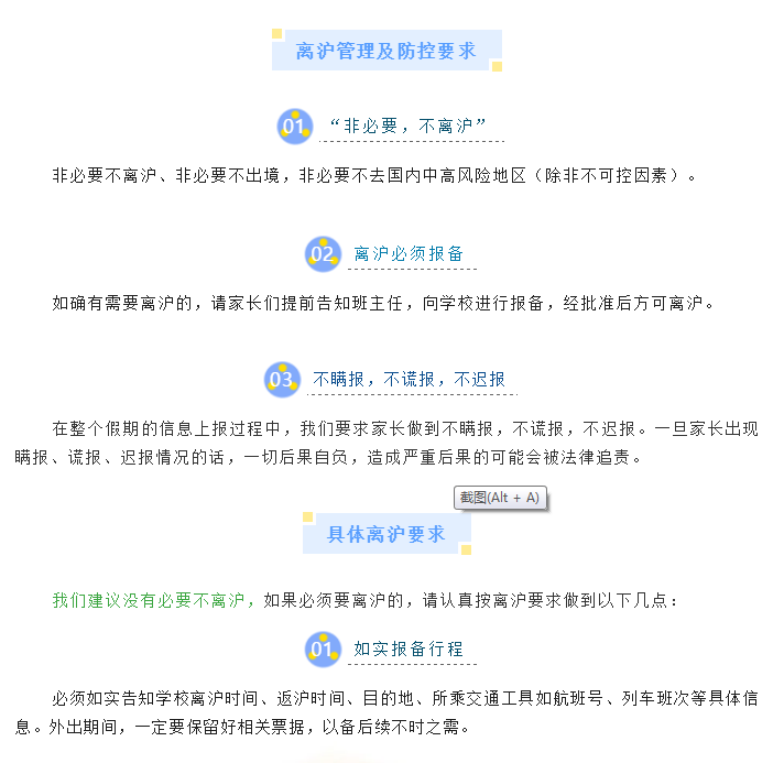 比如蓬莱二小就要求同学们非必要不离沪、非必要不出境,非必要不去国内中高风险地区(除非不可控因素)。如确有需要离沪的,请家长们提前告知班主任,向学校进行报备,经批准后方可离沪。在整个假期的信息上报过程中,学校要求家长做到不瞒报,不谎报,不迟报。一旦家长出现瞒报、谎报、迟报情况的话,一切后果自负,造成严重后果的可能会被法律追责。如果需要离沪,学校要求家长必须如实告知学校离沪时间、返沪时间、目的地、所乘交通工具如航班号、列车班次等具体信息。外出期间,一定要保留好相关票据,以备后续不时之需。