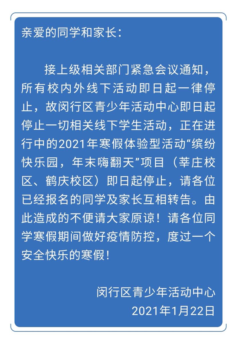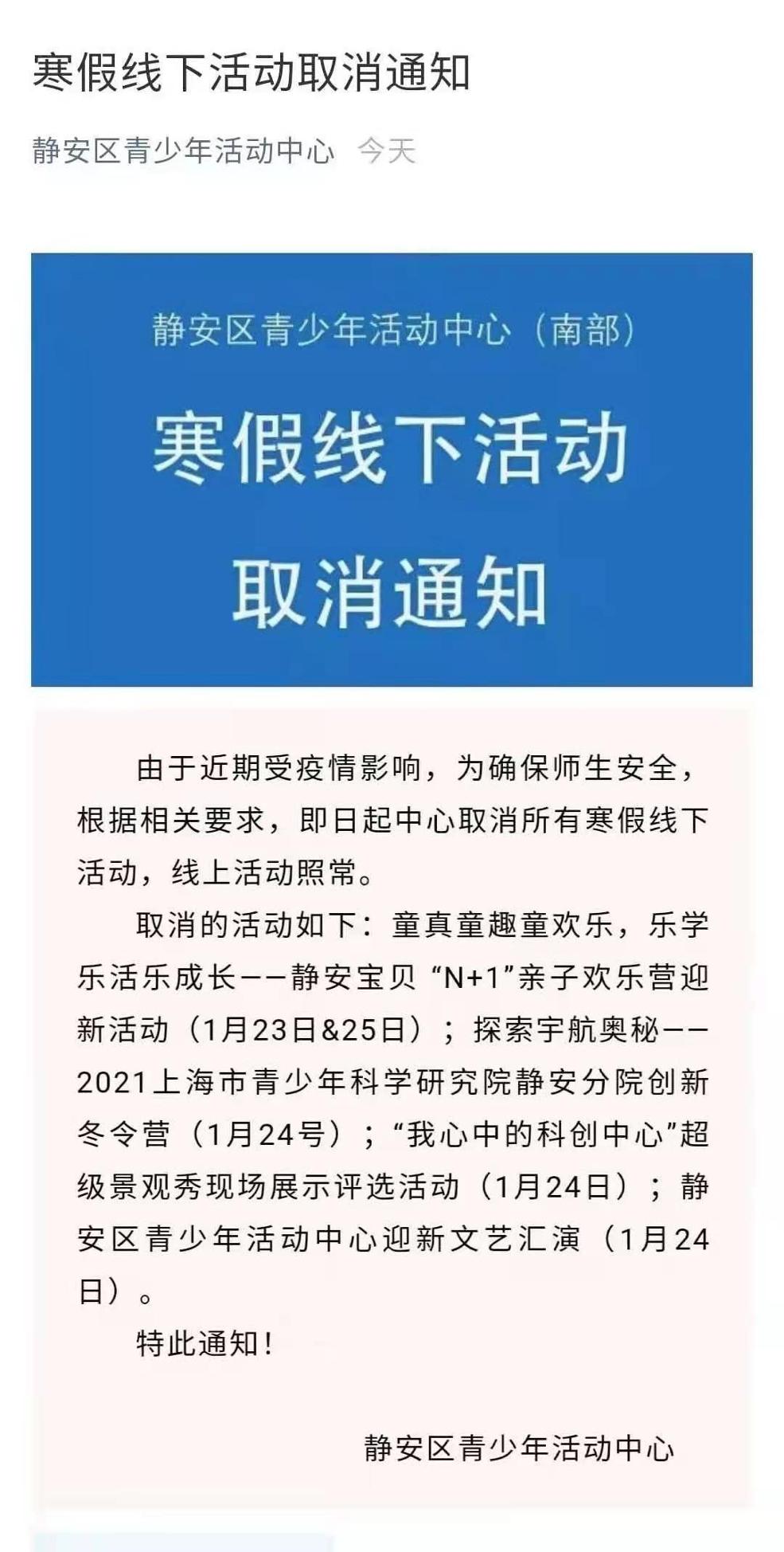 此外,记者了解到,受疫情影响,一些线下活动也取消了。比如静安区青少年活动中心就发布通知称,中心取消所有线下活动,线上活动继续。