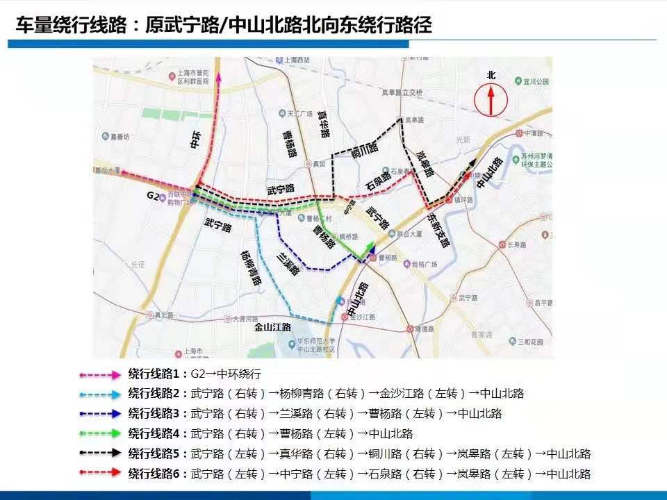 据悉,从G2方向过来进城的车辆,如果要转内环高架,可沿武宁路直行后左转至真华路,再沿铜川路、岚皋路,进入内环高架。如果错过可左转的真华路,那么只能直行至武宁路桥下的光复西路,调头后再沿武宁路直行至中山北路路口右转。而出城方向原先要在武宁路中山北路路口左转的车辆,则可通过长寿路、普雄路及真华路绕行。此外,武宁路曹杨路路口上月底开始也进行了调整,曹杨路南向北行驶至武宁路的车辆只能右转,不能直行或左转进入武宁路,因此,需左转到武宁路的车辆应从真华路提早绕行,在曹杨路真华路路口右转,随后在武宁路真华路路口左转进入武宁路。