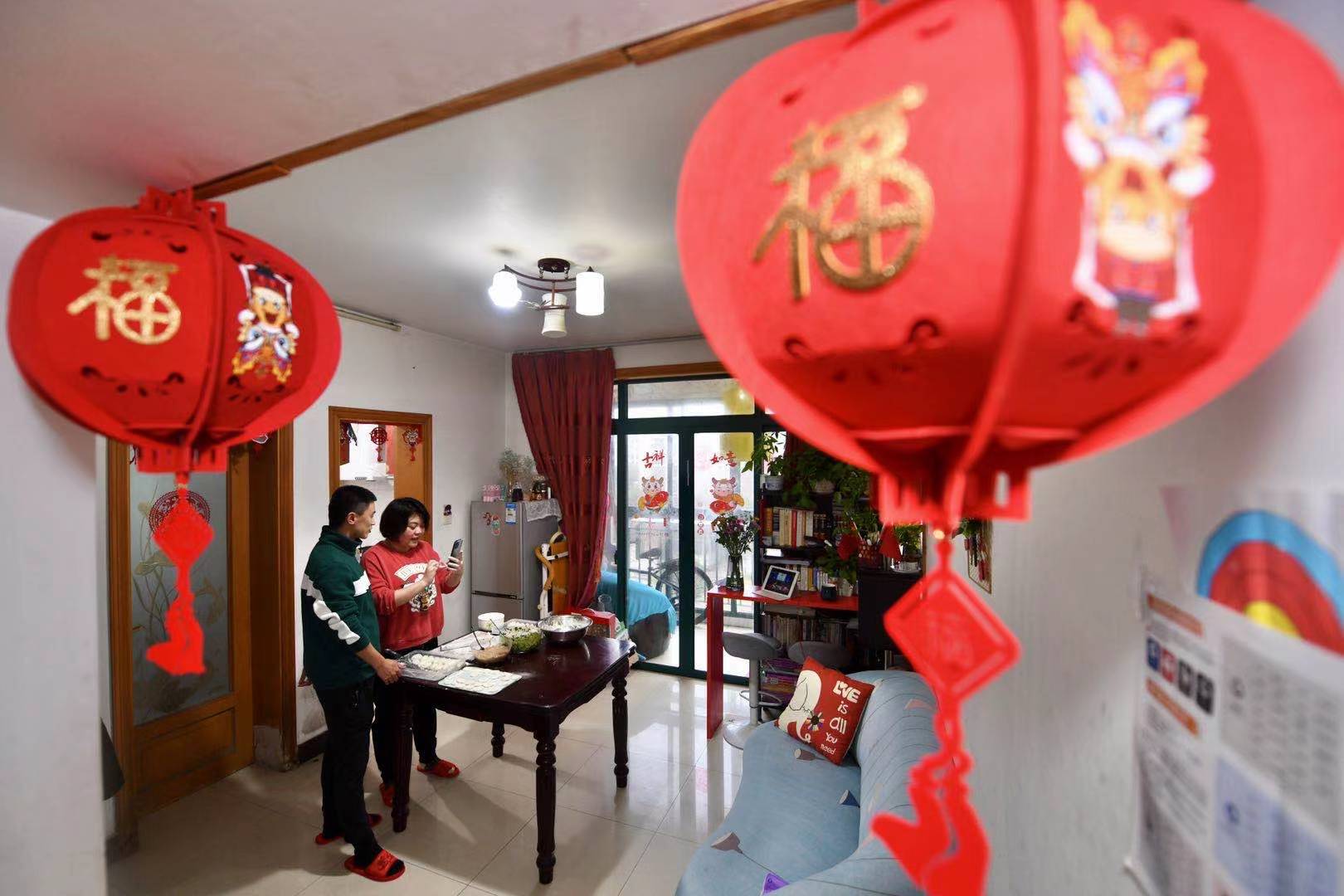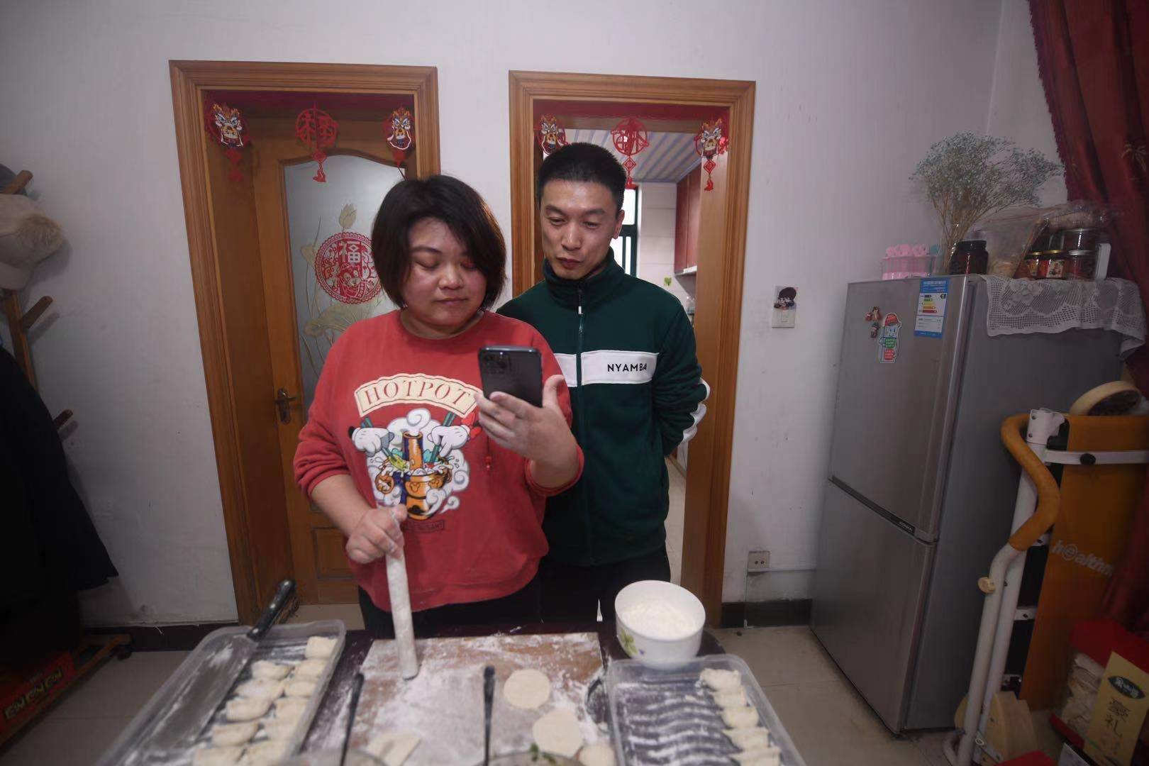 只见翟女士擀面皮,赵先生包饺子,两人都撸起袖子“加油干”。“我们这里一切都好,等解封了我们就回去!”包饺子的过程中,他们还与远在家乡的父母视频连线云“过年”,给远方的亲人报了平安。
