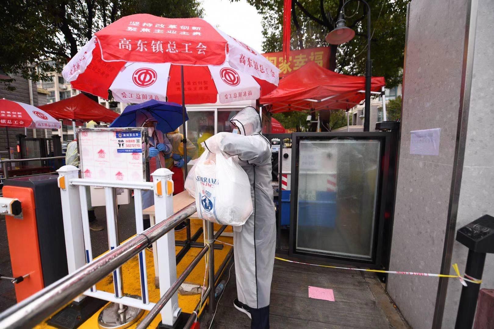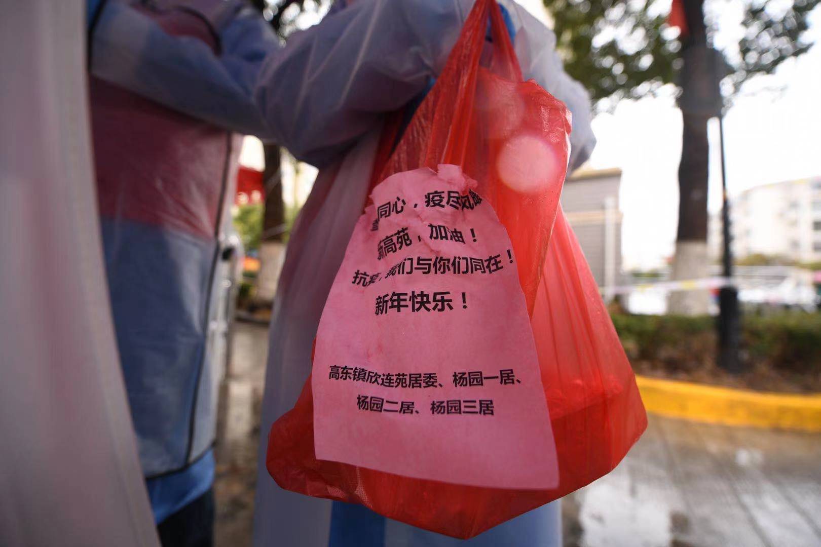 下午三点多,记者来到新高苑小区南门,这里是这个封闭小区目前唯一的出入口。李阿姨和老公提着四五个大包小包交给门口志愿者,让他们把“年货”带给儿子一家。“主要都是蔬菜、水果,还有几盒我们上午刚包的饺子,今年没法一起过年,能吃上我包的饺子也是好的。”李阿姨笑道。