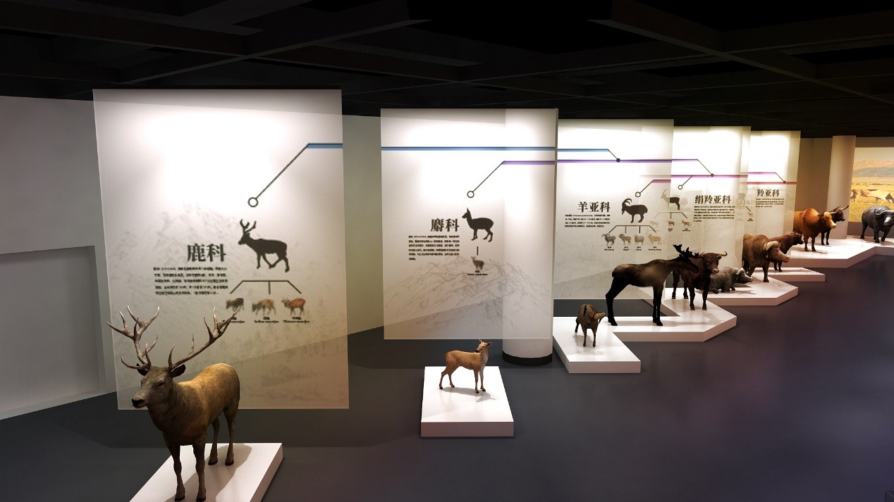 为什么牛被选入十二生肖,还要排在第二?牛与人是什么关系?带着这些序中的问题,观众进入第一单元“平行乐章”,在这里,观众可以看到数百万年来牛和人的演变历史。这个时期每一个物种都像单独的音符,在历史上谱写自己的乐章,它们共同存在却又相互平行。这个单元一共展示了18件标本,包括还未在展区展出过的蓝牛羚是解剖和行为最接近牛亚科祖先的一种牛类;以及威武又萌态十足的美洲野牛。观众能够直观地感受牛科动物和它们的亲属究竟长什么样?差别在哪里?进入文明社会后,牛和人又以何种关系存在呢?