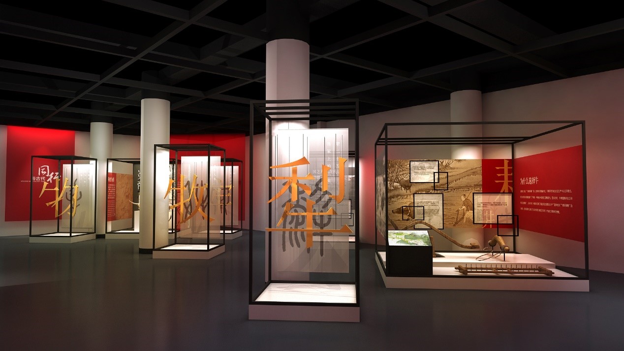 牛年生肖展以文化板块作为序厅,在这里,观众可以感受到大红色的主题背景带给观众的视觉冲击,寓意牛年红红火火,展厅中间垂下的纱幕中的诗词和两侧墙面的版画,突出了牛在中国传统文化中的重要性。