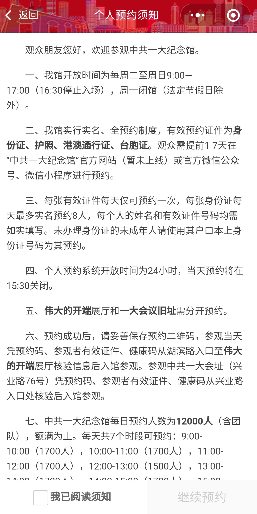 中共一大纪念馆,这个夏季也格外火热。纪念馆分为个人预约和团队预约,观众需要提前1-7天在中共一大纪念馆官方微信号上进行预约。个人预约系统开放时间为24小时,当天预约在15:30分关闭。