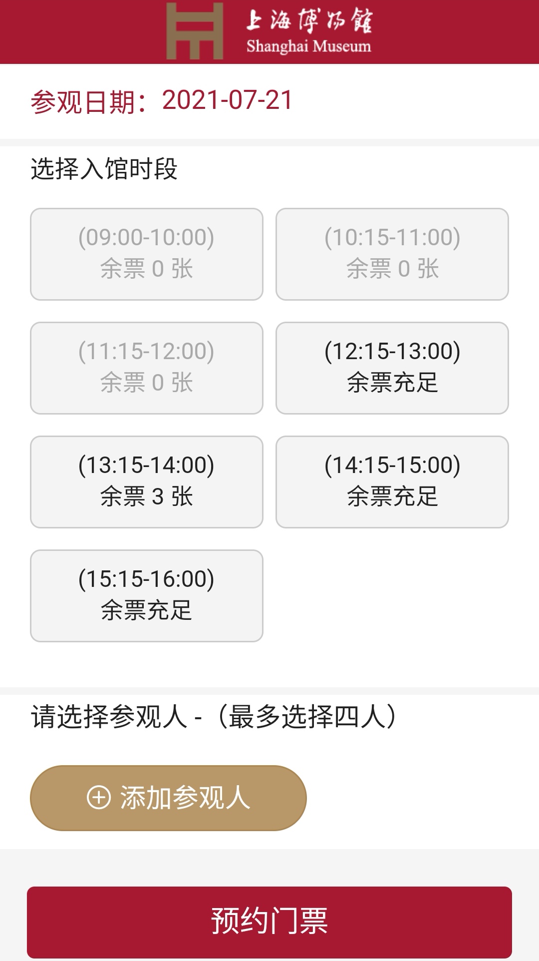 参观上海博物馆需要预约,预约之后要按照预约时间参观,如果错过时段将谢绝入馆。记者在官方微信上点击预约后发现,7月21日余票不足,但是7月22日各时段的票量都充足。观众如果要预约最好是提前两天,方便选择时间段。