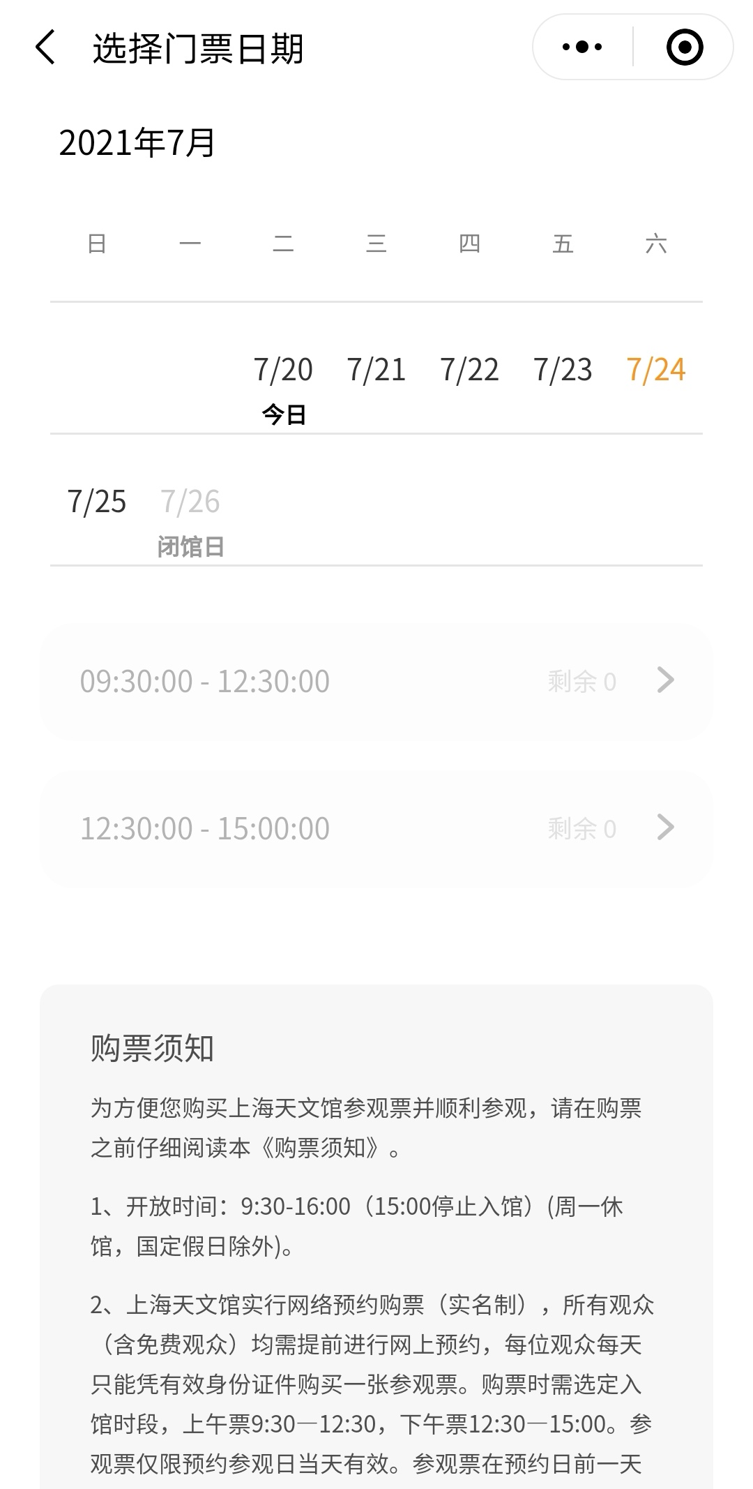 记者在“上海天文馆”购票微信小程序上看到,7月18日至24日的门票已经全部预约完了!不过好消息是,从7月25日起,上海天文馆每日参观票数量调整为5000张,球幕电影场次将增加至7场,自7月19日00:30起预售。同时,暂停“一成人一学生网售票”和“一成人两学生网售票”票种的销售,观众可选择购买相应的“成人网售票”和“学生网售票”预约参观票。