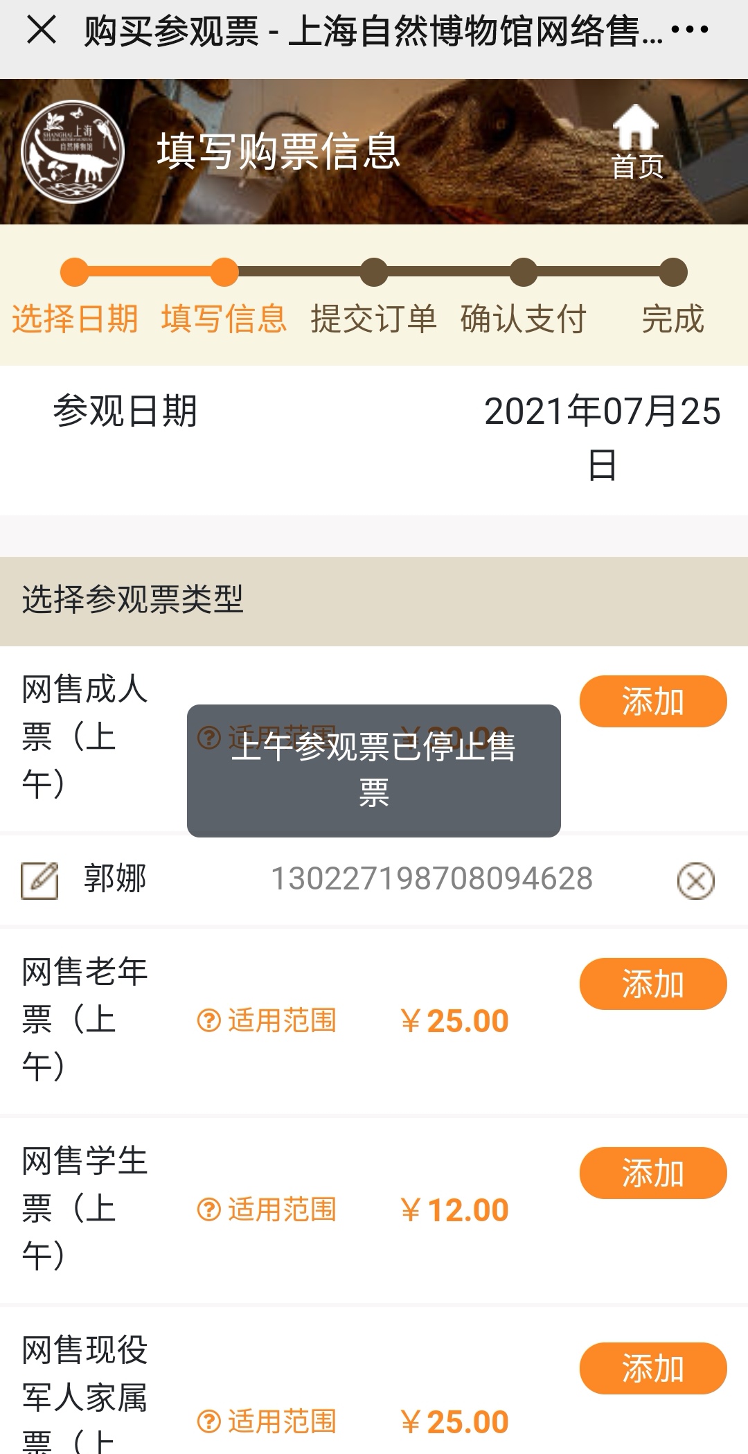 记者登录上海自然博物馆公众号预约发现,上海自然博物馆只剩下7月23日上下午场有票,7月24日和25日因为是周末,票已经售完。