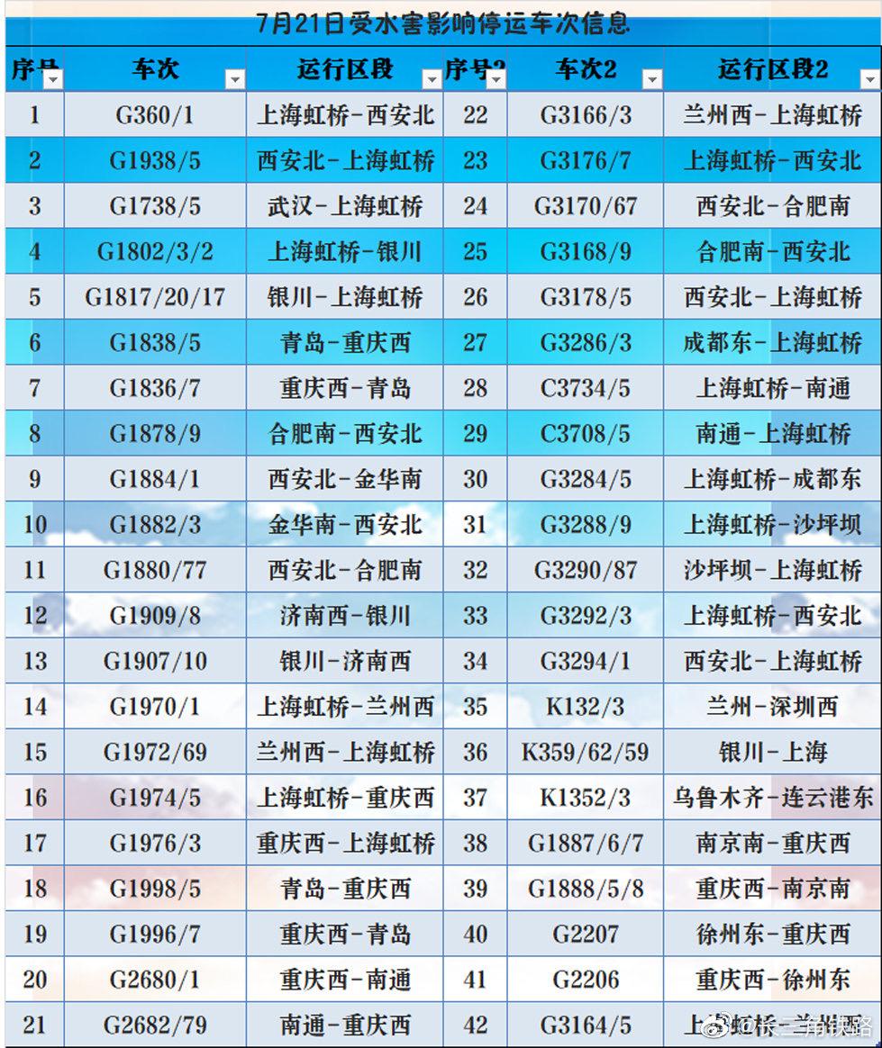 7月21日,受连日郑州水害影响,往郑州方向多趟列车停运,目前梳理了部分停运列车车次信息。铁路部门提醒旅客,停运、折返等列车调整开行相关信息,请以车站公告为准,若有疑问可致电铁路客服热线021-12306咨询。