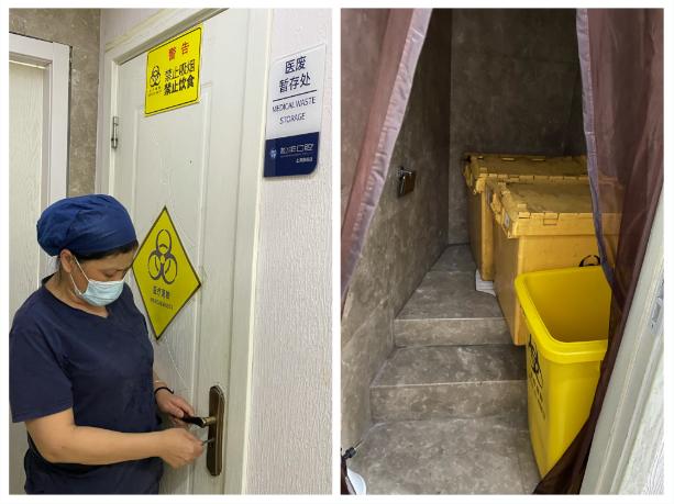 四川北路一家牙科诊所的工作人员告诉记者:“以前半个月来收一次医疗废物,疫情期间,一次性手术衣、口罩等防护用品用量大,医废暂存处的垃圾堆积如山。现在隔一天就清空一次,整洁多了。”
