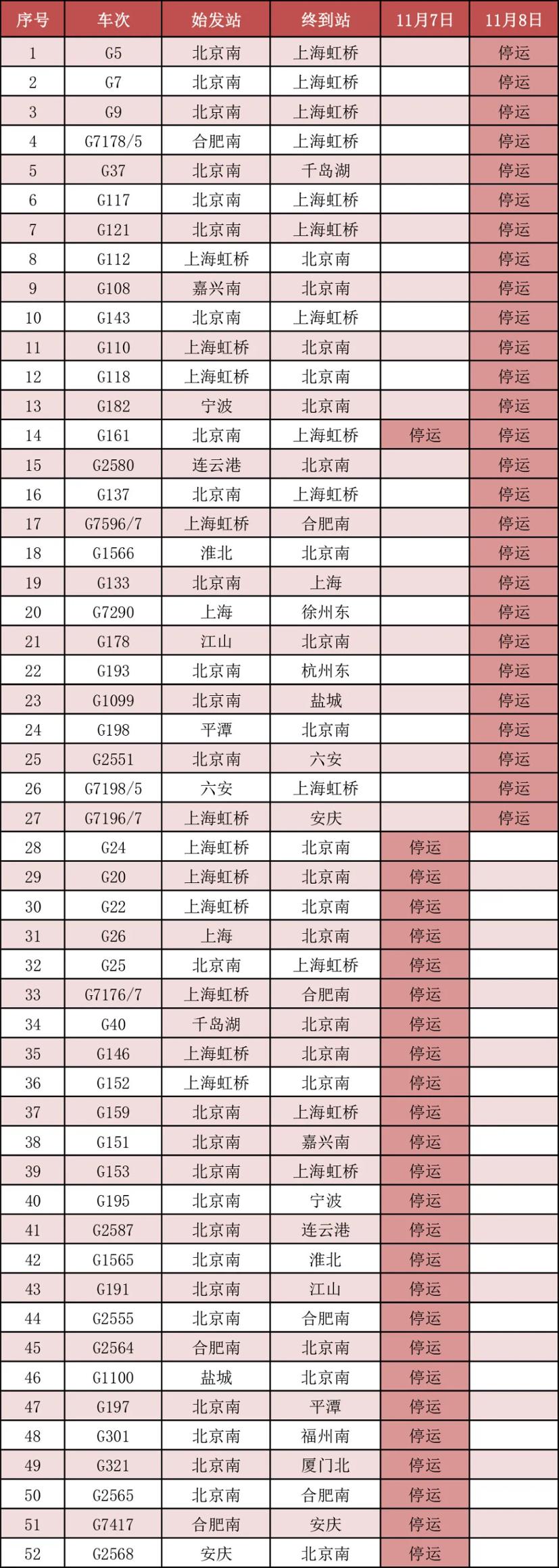 11月7日、8日, 受北方降雪天气影响,导致途经京沪高铁部分列车晚点或停运,涉及长三角铁路管内部分停运列车车次见下图。