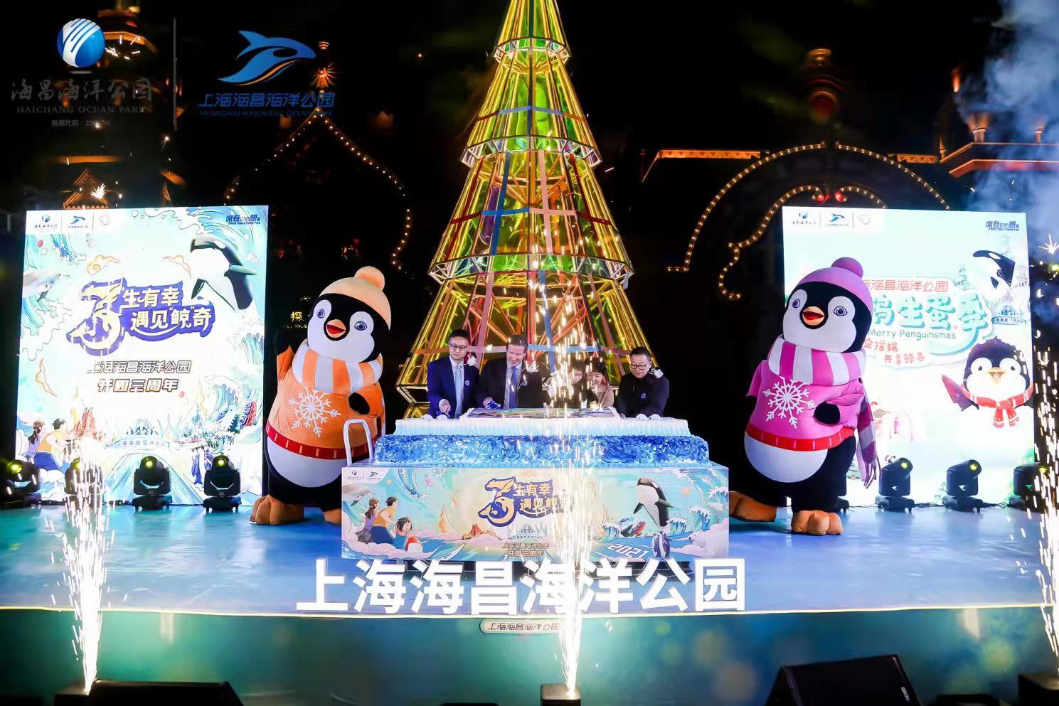 当晚,“上海海昌海洋公园三周年庆典暨企鹅生蛋季启幕仪式”于极地小镇启动,海昌海洋公园控股有限公司CEO张建斌先生等人共同切下生日蛋糕,11.16米高的海洋圣诞树在欢呼声中被瞬间点亮,这也象征着上海海昌海洋公园企鹅生蛋季正式启幕。仪式现场,芬兰驻沪总领事馆总领事何朗明跨国连线远在芬兰的圣诞老人,和现场游客朋友开启一场真实而浪漫的“云”见面,感受如梦如幻的真实冰雪秘境。同时,也有知名DJ和潮流乐队空降海洋,众人陶醉在音乐、热舞中。