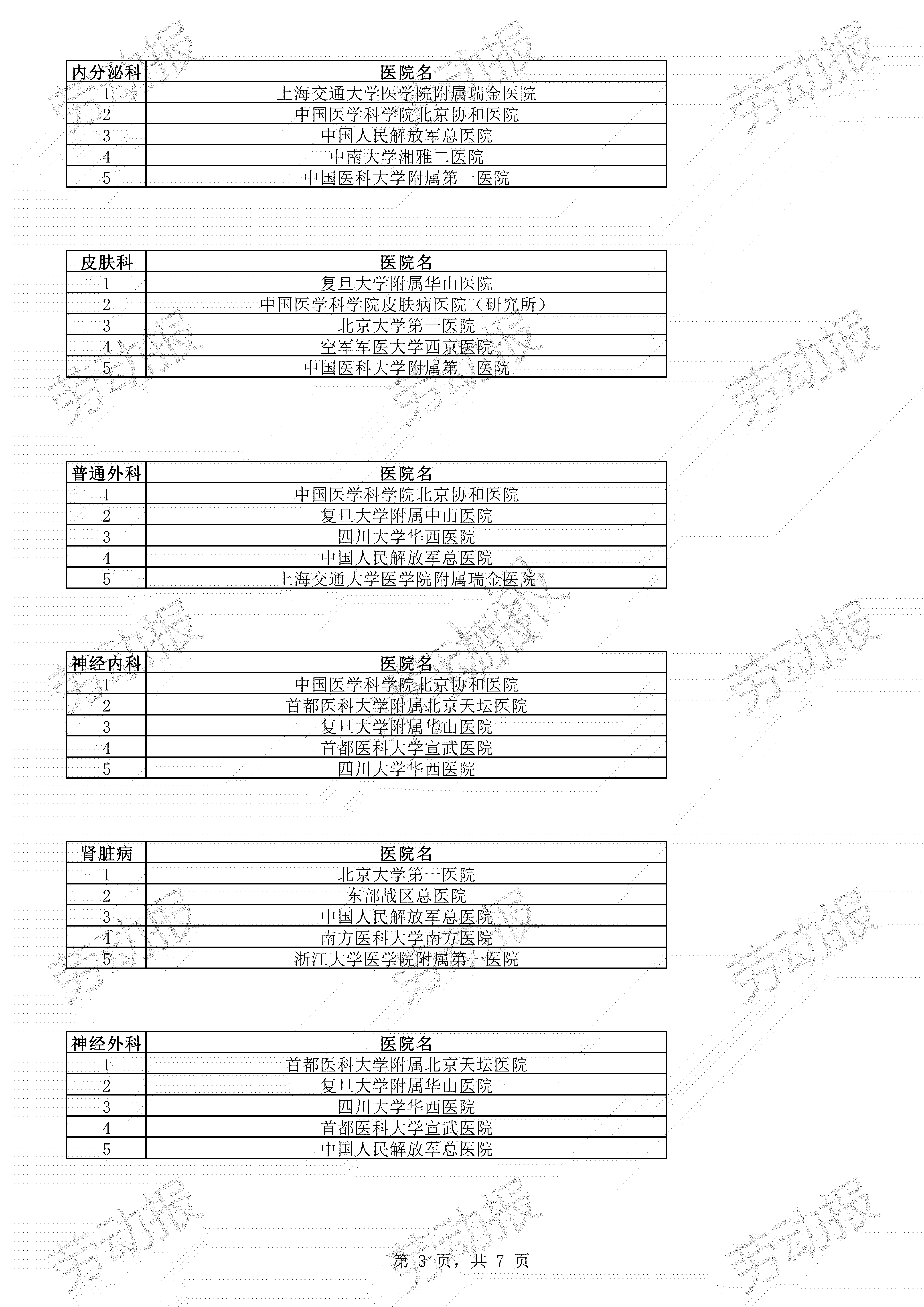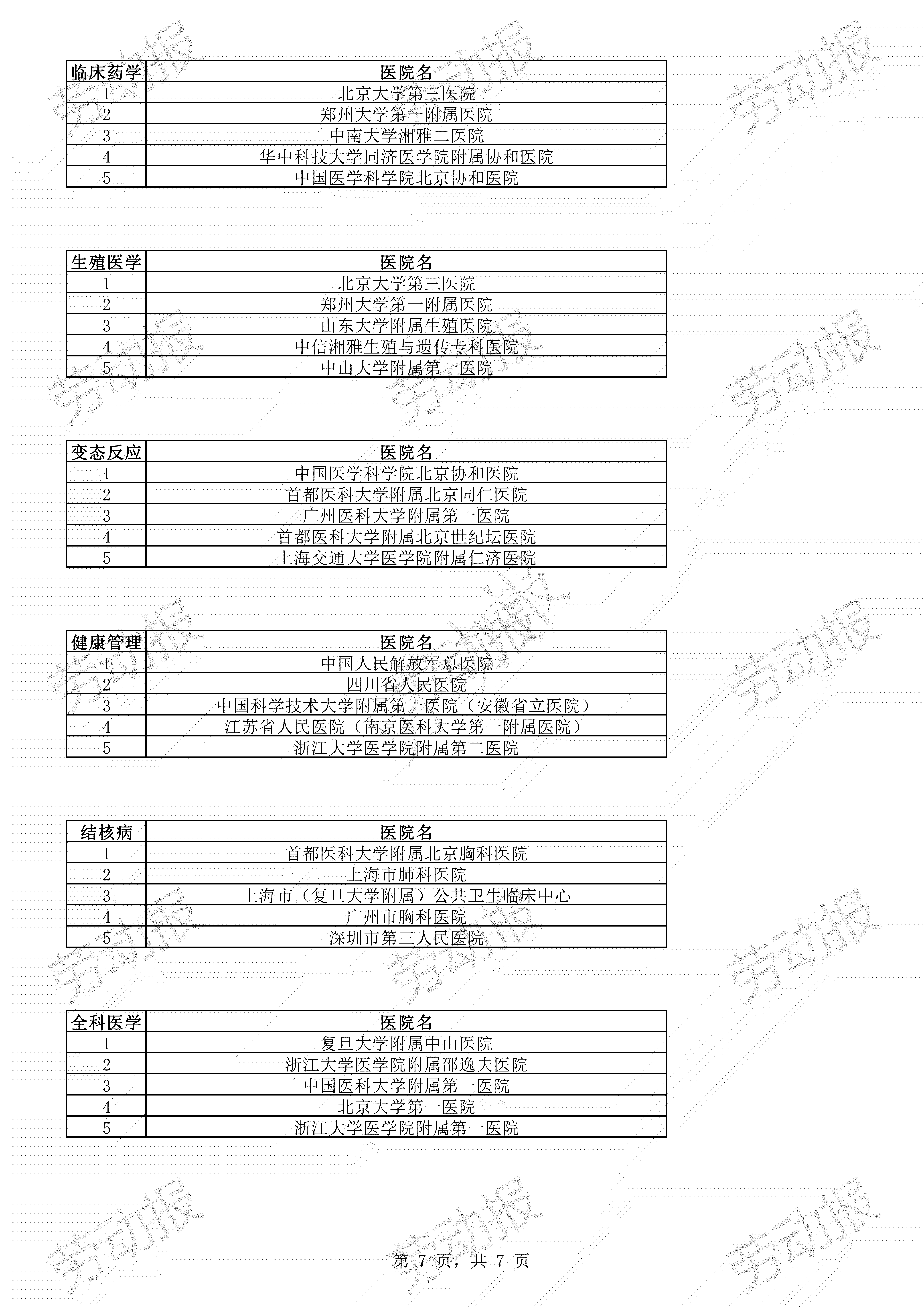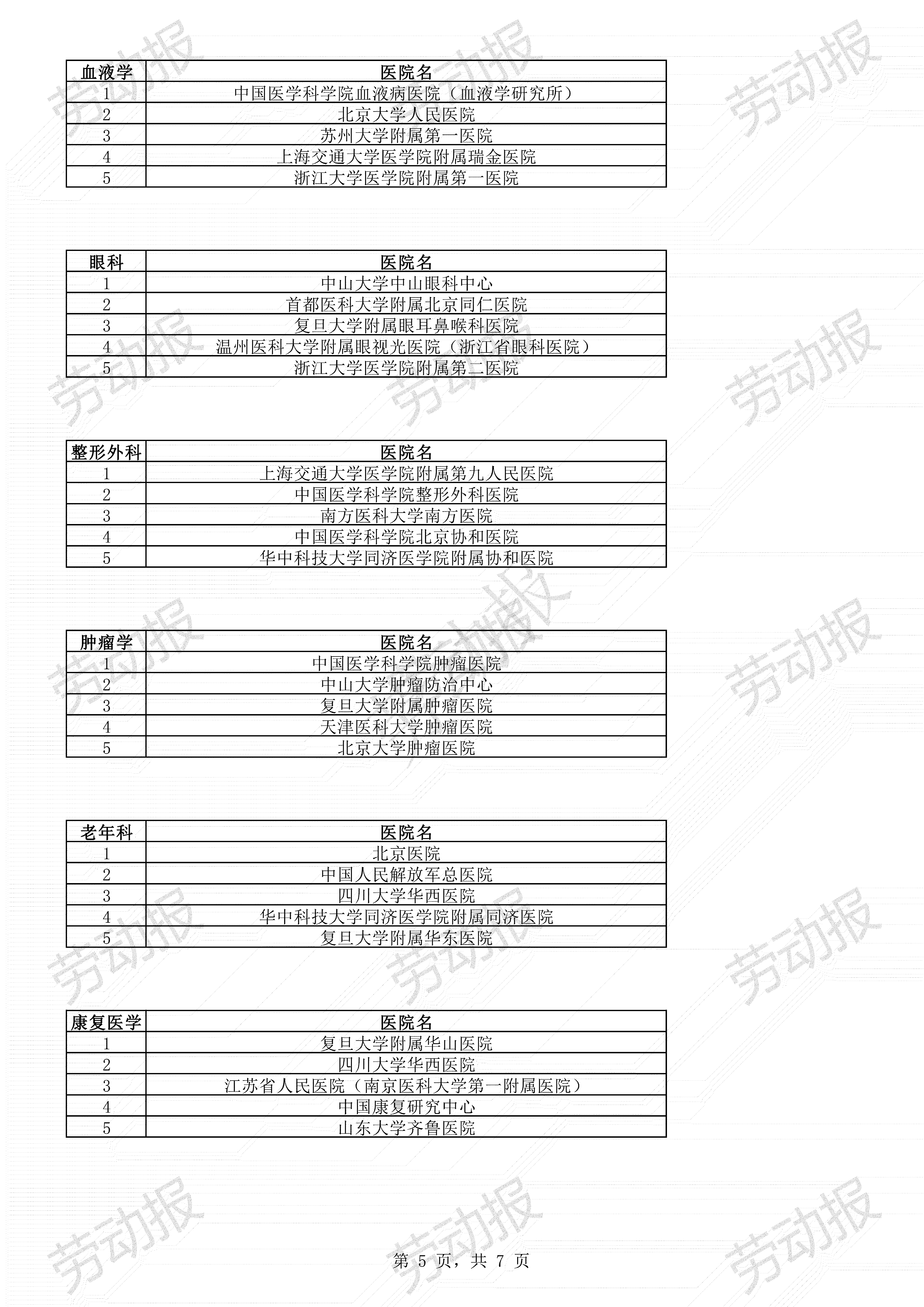 中国医学科学院北京协和医院、四川大学华西医院、中国人民解放军总医院、复旦大学附属中山医院和上海交通大学医学院附属瑞金医院位列排行榜前五名。全国共有100家医院进入“复旦版中国医院综合排行榜”,42个专科(前10名)榜上有名。