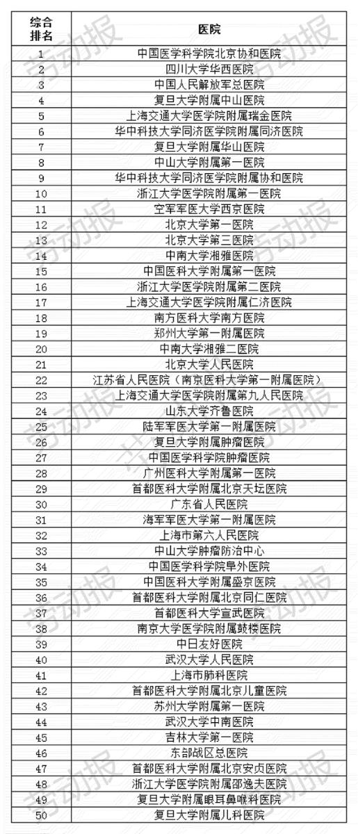 2020年度全国医院综合排名前50: