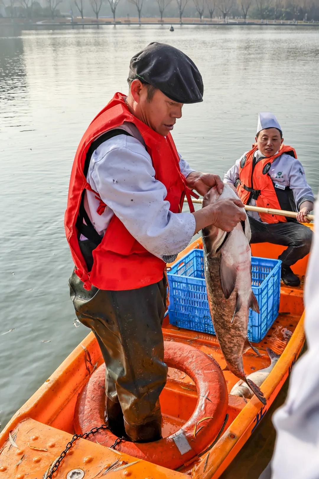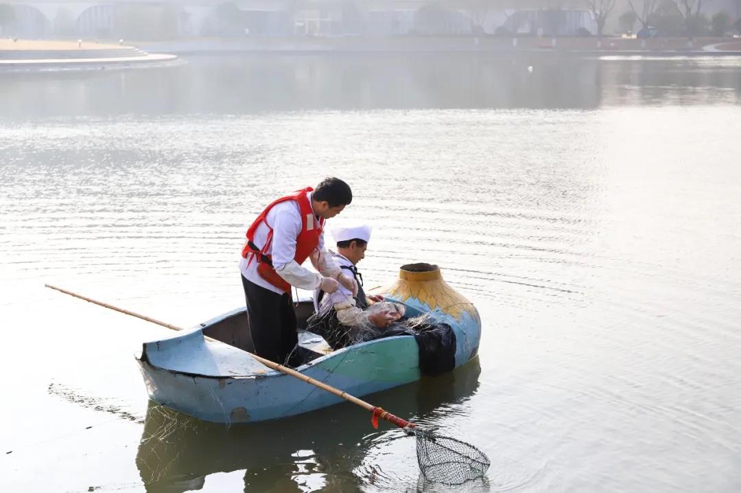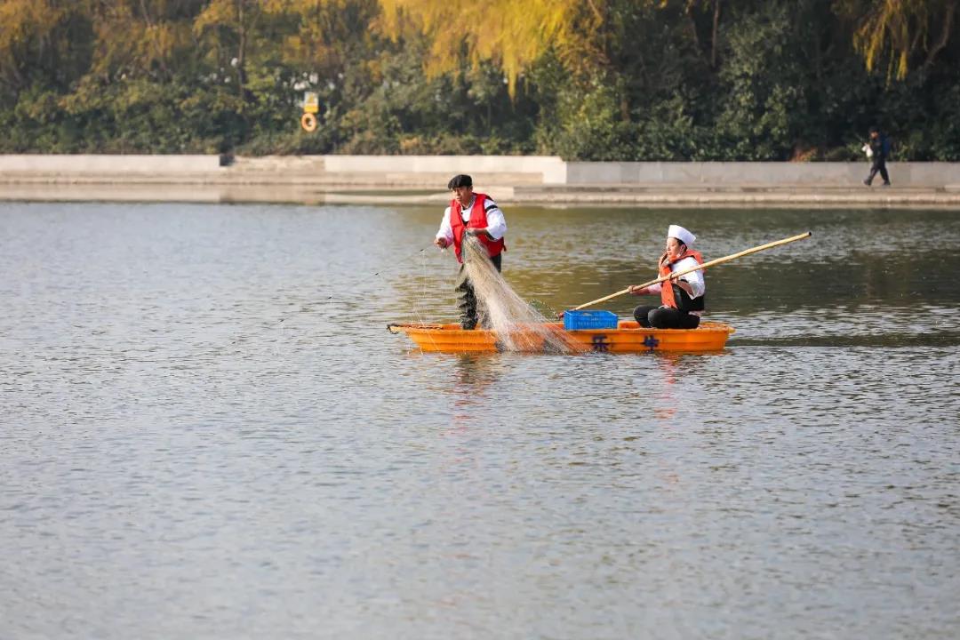 在松江校区的思源湖收网捞鱼!