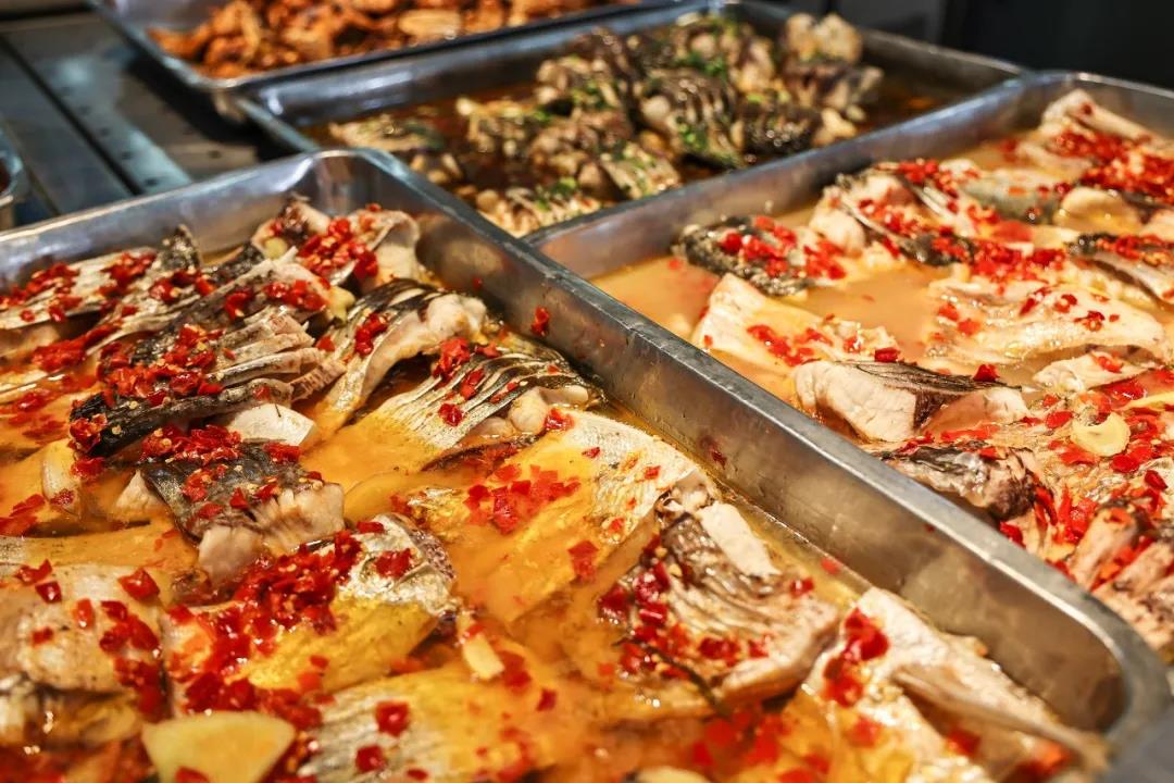 学校一食堂一楼摆出了“全鱼宴”