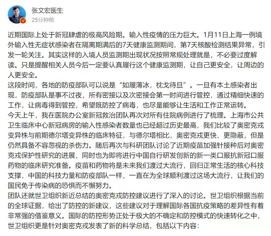 今天上午,我在医院办公室新冠救治团队再次对所有住院病例进行了梳理。上海市公共卫生临床中心新冠病房的输入性感染者数量也已经超过历史最高,我们比较了奥密克戎变异株与前期德尔塔变异株的临床特征,与德尔塔相比,奥密克戎更快、更隐蔽,但是仍然具备不容忽视的杀伤力。随后再次与科研团队讨论了近期疫苗加强针接种后对奥密克戎保护性研究的进展,同时也为即将进行中国自行研发创新的新一类口服抗新冠口服药物的临床研究准备。疫苗和药物将是未来我们渡过大流行,回归正常生活的核心科技支撑,中国的科技力量和防疫部队一样,一直在为全球顺利渡过这场大流行,让我们的国民免于传染病的恐惧而不懈努力。