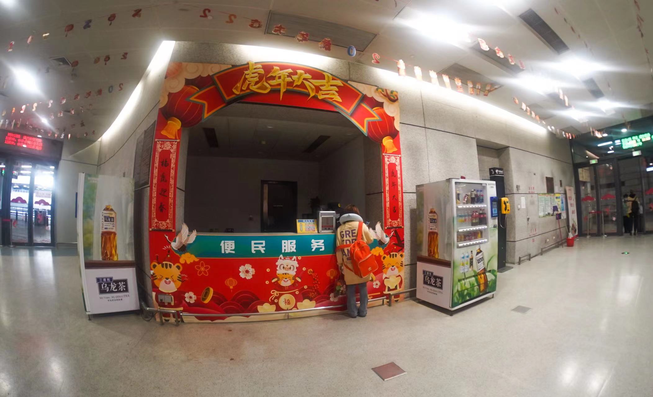 进入候车大厅,映入眼帘的是满满的红色元素,正中央搭建了一块大型红色立体背景墙,中间卡通萌萌的虎年生肖造型在各种形象图案的簇拥下格外注目,引来过往乘客合影留念。而便民服务窗口也被年味包围,候车大厅售票窗口及玻璃门贴满了各类春节的剪纸窗花,两侧大幅的春联更添喜庆,大厅一侧还布置了绿植,植物枝干上点缀了各类写满新年祝福的挂件。