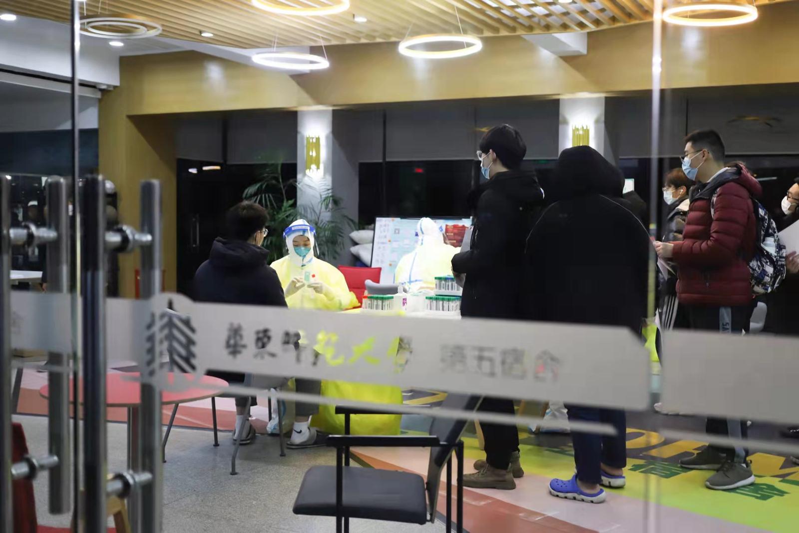 寒假以来,上海不少地方在接受疫情防控排查协查,1月14日起,华东师范大学普陀校区第五宿舍实行2天48小时封闭管理,近500名寒假留校学生和宿管人员接受核酸检测等排查工作。
