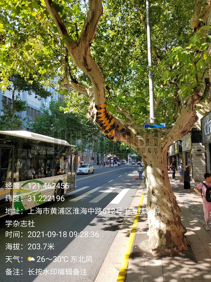检察官仔细观察淮海中路沿线车辆的行驶路线后得出结论,由于梧桐树枝干向道路中央倾斜,导致中大型车辆的道路净空过低,不熟悉路况的车辆经过时往往不能及时避让,易与行道树发生碰擦,有些树枝经长期碰擦,重心愈发不稳,枝干也已明显变细。