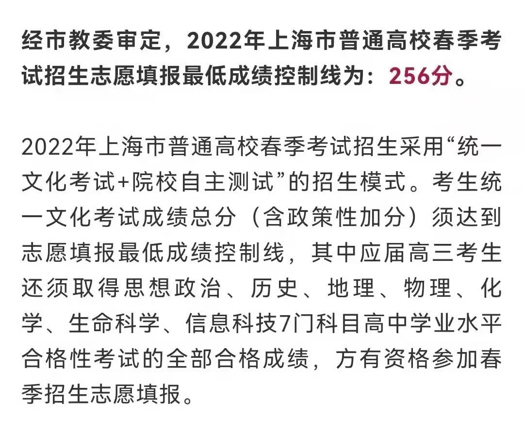 1月25日,上海市教育考试院发布了2022年上海春招志愿填报最低成绩控制线确定,为256分。