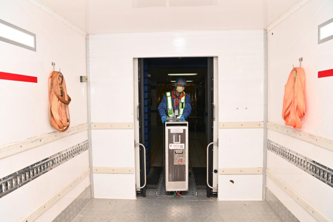 为了应对春节期间增加的配餐需求,航机保障部增派了岗位人手,负责搬运装箱的小伙子们个个面庞精干有力,步伐坚定迅捷,将一辆辆装满餐食的小推车运入配餐货车后箱,整个流程井然有序。