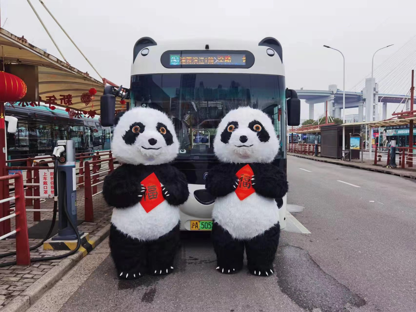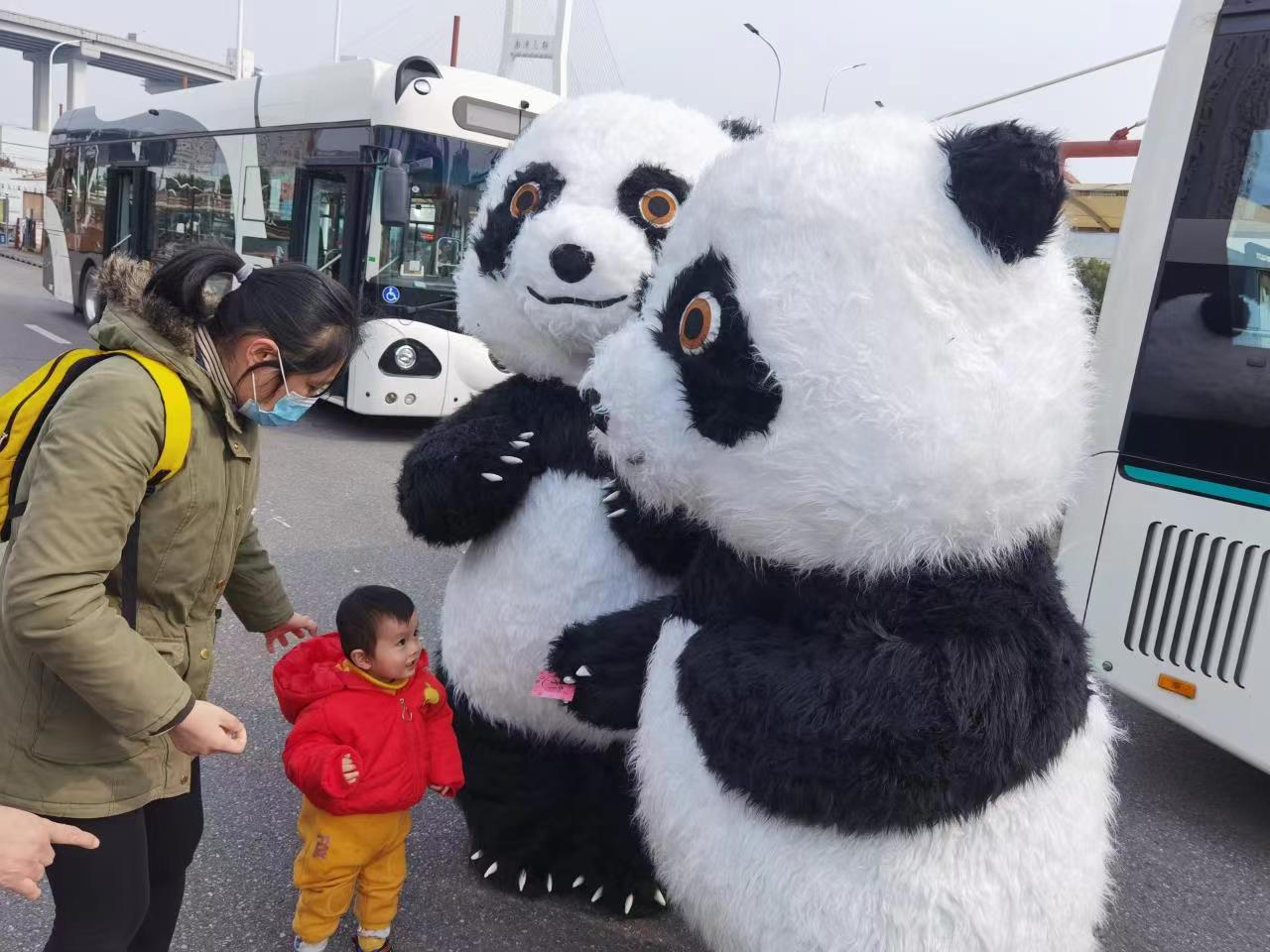 大年初五早晨,两只可爱的大熊猫吉祥物宝宝出现在浦西滨江1路南浦大桥沪军营路终点站,只见熊猫宝宝们手上拿着“福”字、新年横幅、红包、金币巧克力,向前来乘坐浦西滨江1路的广大市民乘客送上新春的祝福。憨态可掬的大熊猫吸引市民乘客前来争相合影留念,市民陈女士说道:“今天是大年初五,趁着好天气,特地带小朋友来这个沪上新晋网红打卡点来体验一番。没想到还能收到大熊猫送上的祝福,真的太幸运了!”