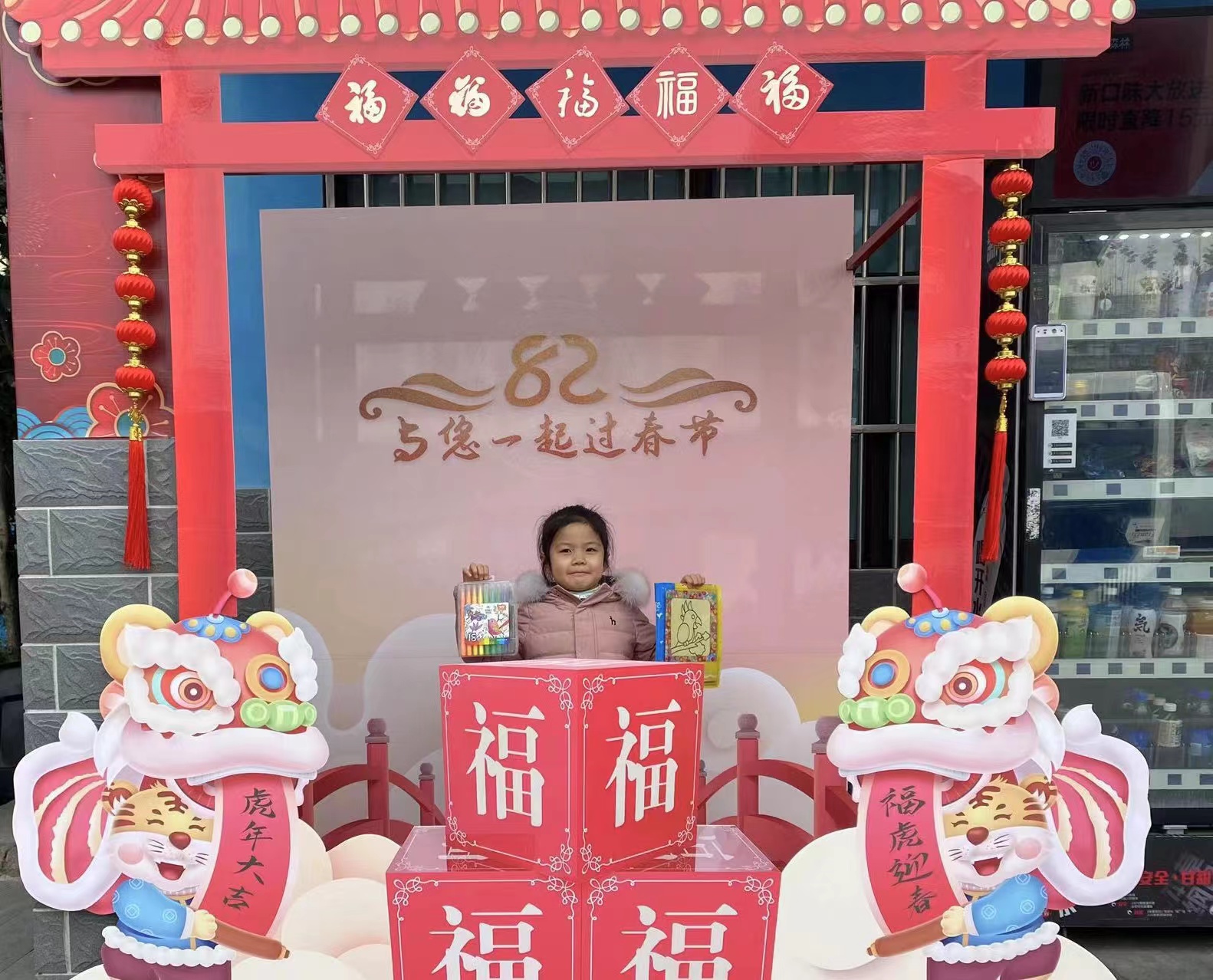 而在陆家嘴滨江枢纽站,整个站点立柱都包裹上了寓意新春红红火火的“虎年大吉”写真,一排排红灯笼飘舞着,欢迎着八方来客,一旁虎头虎脑的打卡框更是引得人们纷纷驻足合影。