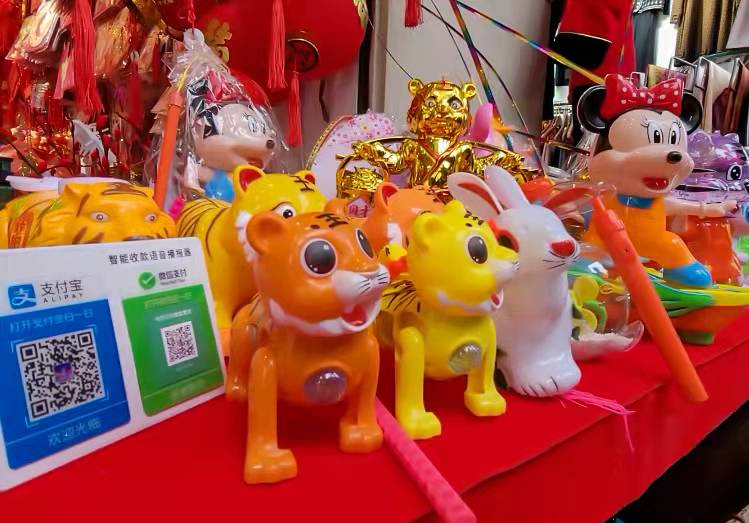 她拿起门口展示的一只橙色“小老虎”向记者介绍:“这个电动小老虎是我们卖的最好的,一只就25元。别看它小,但是特别适合小朋友拿着,前面按钮一按,你看,不仅能四肢走动,胸前还能发出镭射光呢。”陈阿姨说,仅这支小老虎平时一天就能卖五六十个,天气好的时候最多能卖一百多个。