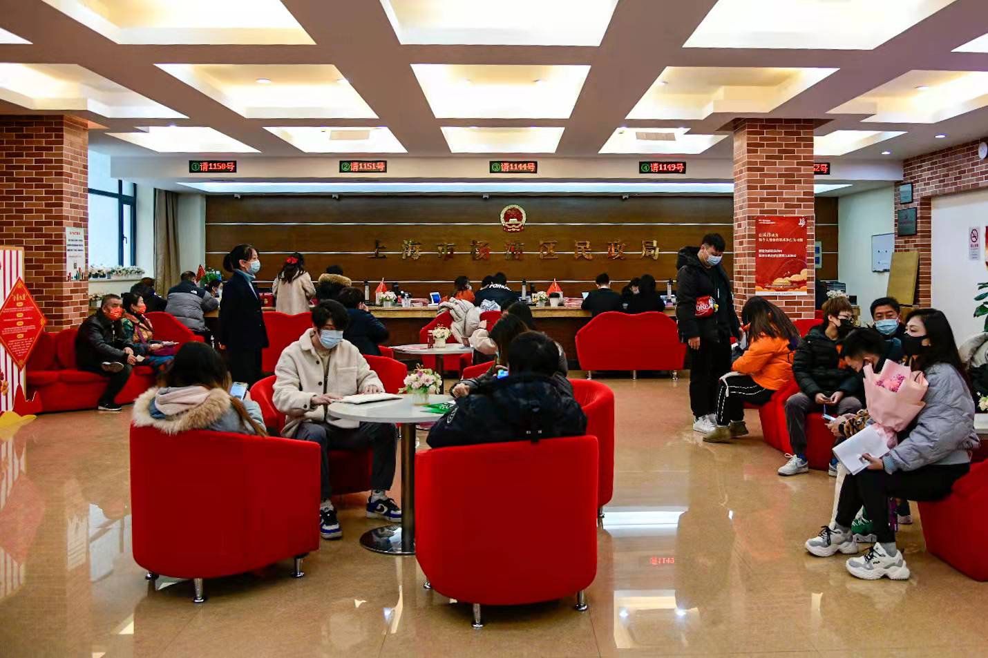 临近中午,杨浦区婚登处的新人依旧络绎不绝,这里上午已经办理了116对新人的婚姻登记,预计下午还将迎来同样忙碌时刻。“今天是疫情以来我们婚登处人最多的一天了。”工作人员告诉记者,今天婚登处全员到岗,平时三个登记窗口今天增加到了五个,早上更是提前一刻钟开门。“上午八点多,有几对没有抢到预约名额的新人来排队了,天气那么冷我们就提前开门给他们办理登记。”工作人员告诉记者,预计今天会有200余对新人完成婚姻登记。