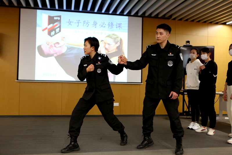 讲课分为三个环节展开,首先是通过图文讲解女性应对突发侵犯类情景应当具备的基本处置原则,呼救、摆脱和远离是教官教授的关键字。第二个环节,两名教官细致讲解了遇到近身侵犯的摆脱动作,现场每一位参与活动的白领小姐姐都进行了实操训练。第三个环节增加了观众互动交流、做游戏等环节,现场笑声一片。