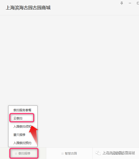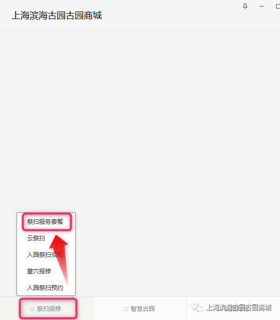关注“上海滨海古园古园商城”微信公众平台,在公众号主页菜单栏选择“祭扫报修”→“祭扫服务套餐”,可根据需求选择套餐类型。