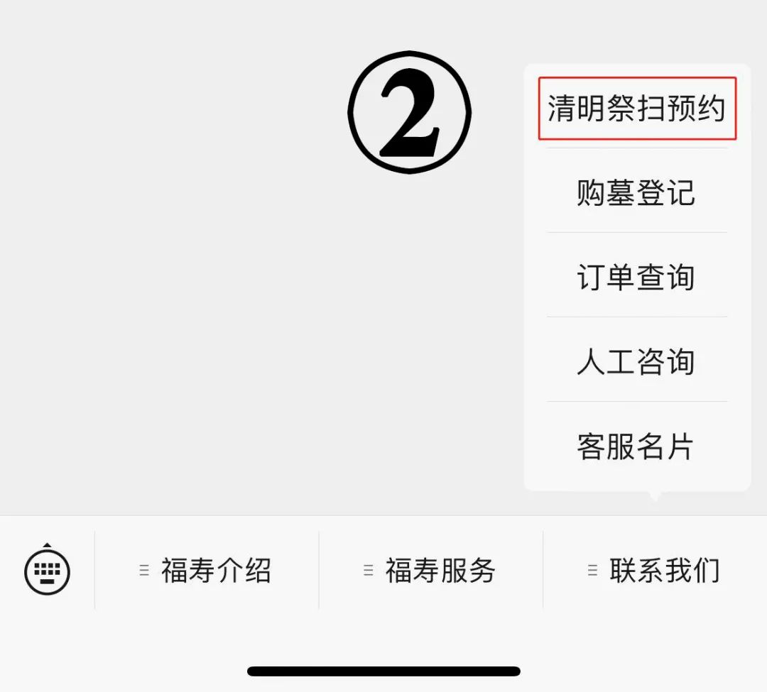 1. 关注墓园微信公众号,进入公众号查看底部菜单,选择“联系我们”→“清明祭扫预约”。