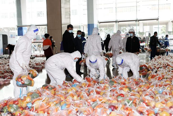 分拨中心3月30日启用以来,已累计采购生鲜食品套餐40.8万份。200余名工作人员、志愿者轮班分拣卸货,目前,日均发放量为5万份左右。