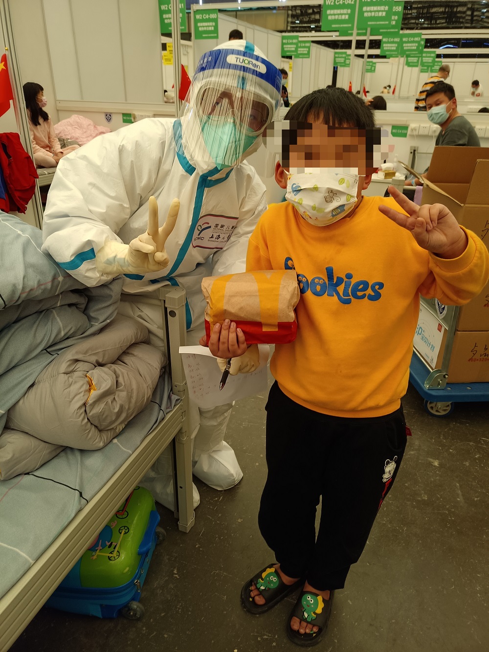 4月9日中午,“大白”们拖着餐车进入了儿童病区,这一餐是某著名快餐企业捐赠的儿童套餐,300多个孩子们的兴奋之情难以言表,有的直接在床上欢呼起来!