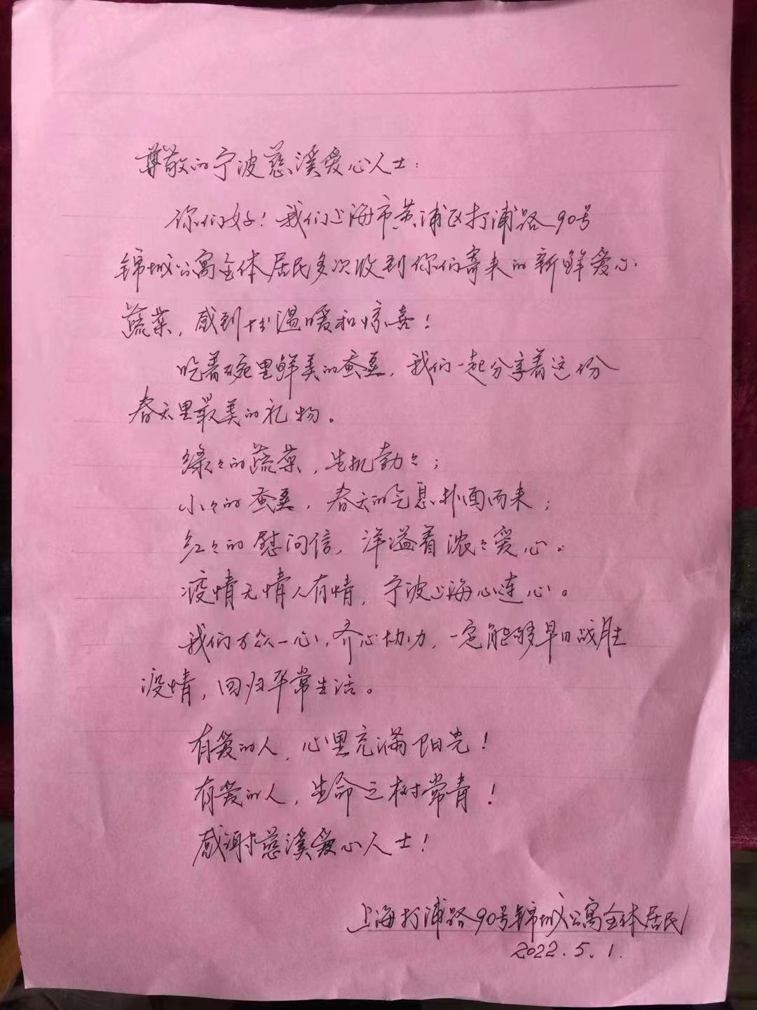 无论疫情多么可怕,总有人在挽着我们,默默前行。5月1日,家住志丹路的退休职工陈阿姨告诉劳动报记者,就在自己蔬菜短缺之时,家门口突然出现了一箱新鲜蔬菜和一封简短的手写书信,令她感觉十分温暖,不禁感动落泪。