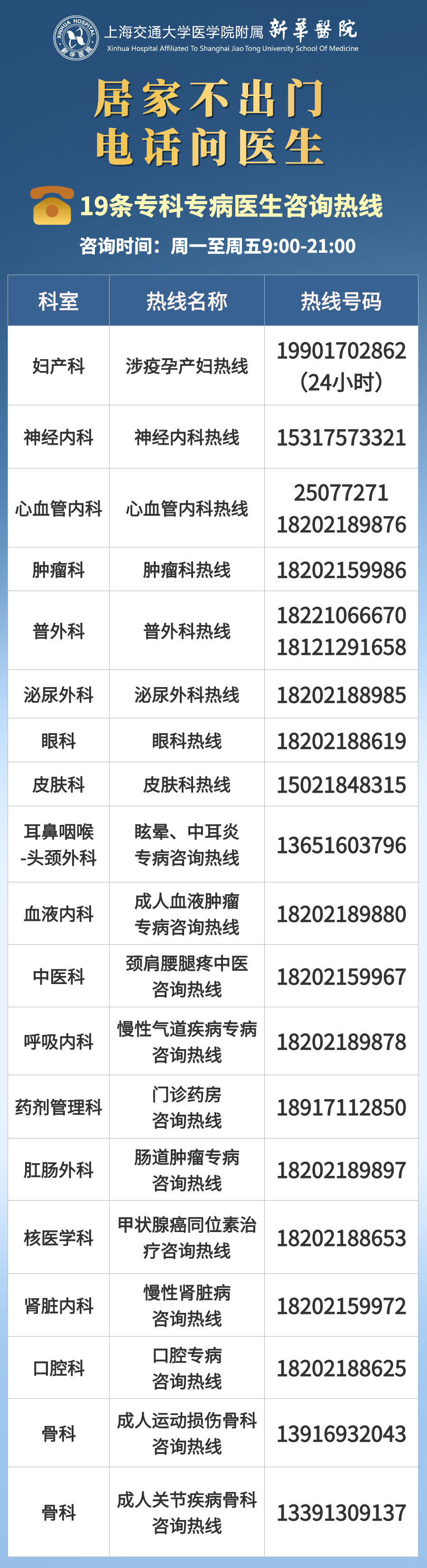 目前,19条热线的服务时间为周一至周五的早上9点到晚上九点。新华医院医务部、门急诊部负责人盛旭俊说:“这些热线是不断梳理门急诊患者需求而动态调整的,一部分是当前老百姓关注度高需求量大的专业,另一部分是新华医院的特色专科。”