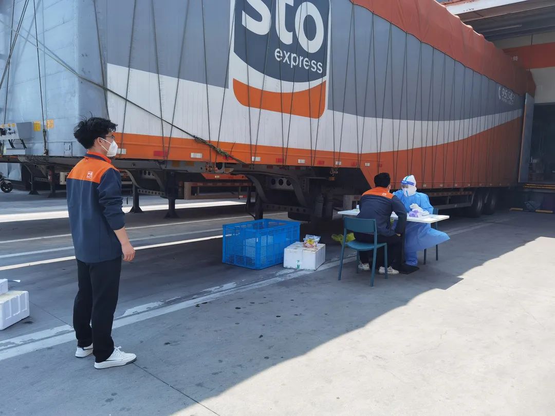上午10点左右,一辆网点的货车来到申通快递上海转运中心赵重园区取货,车辆经过消杀后,工作人员要求驾驶员主动出示健康码、行程码及24小时内核酸结果、车辆纸质通行证、纸质任务单、扫描场所码,在当场完成抗原检测显示阴性后,并在车门处贴上封条,货车进入操作场地。在转运中心内,驾驶员全程不允许下车,由场地装卸工搬运包裹,从而实现闭环管理。外省市来的货运车辆,则需要调换车头,再将货物运入场地。