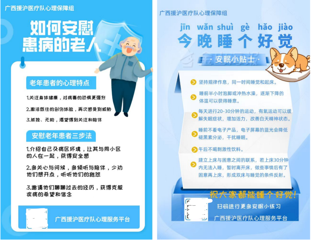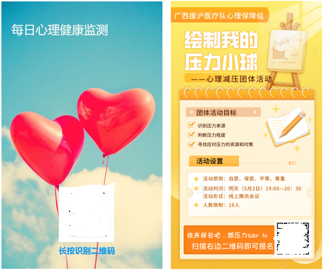 同时,“广西援沪医疗队心理服务平台”也对方舱内1000多名患者开放。患者可以通过扫描二维码进入平台,进行心理自测、放松训练和线上一对一的视频、语音咨询。通过线上和线下的方式,从心理、行为等多方位出发,针对性地提供多种心理服务,向患者传授睡眠和情绪调节的技巧,守护好每个“舱友”的心理健康。