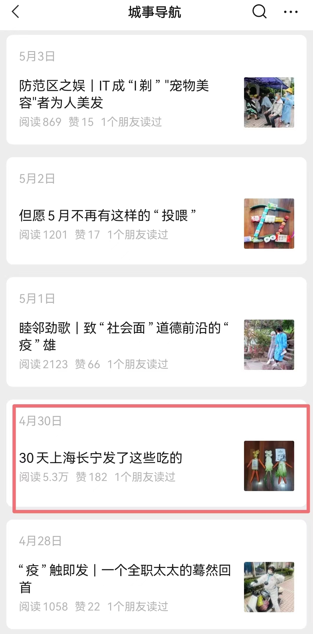 《1.88米的大“跑腿”|他的身体里装了5个支架呢》,写出物业经理楼明华默默贡献的大小事;《比风还难追的傅书记》,道尽了武夷居委书记傅佳杰辛苦忙碌的日常;《30天上海长宁发了这些吃的》,更是获得5.3万的阅读量。